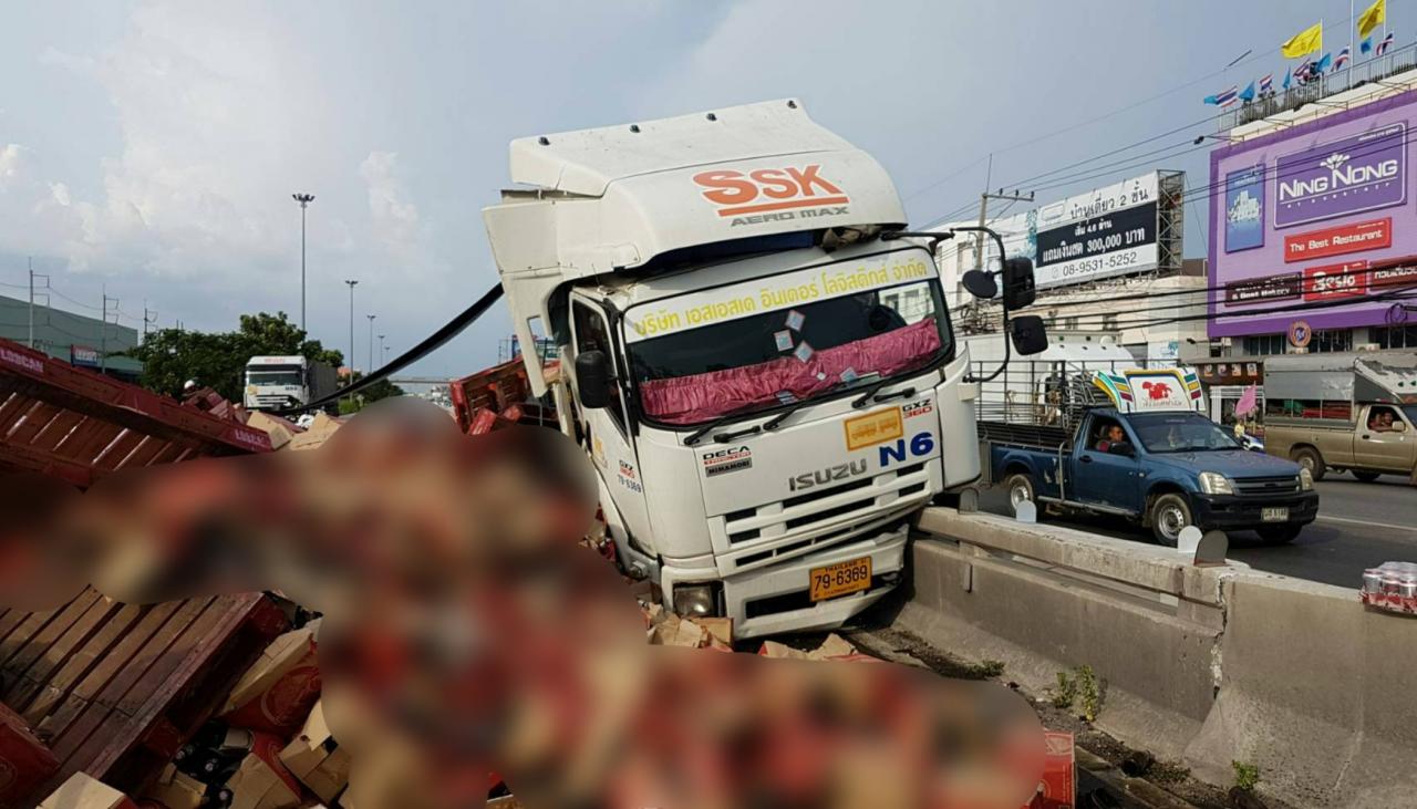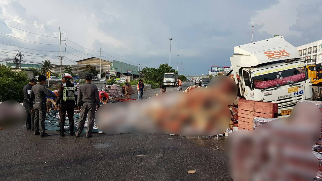 จากนั้น ร.ต.ท.อนุชา แก้วก่ำ รอง สว.สอบสวน สภ.เมืองสมุทรสาคร รุดไปตรวจสอบที่เกิดเหตุ พบรถเทรลเลอร์ 18 ล้อ ยี่ห้ออีซุซุ สีขาว หมายเลขทะเบียน 79-6369 กรุงเทพมหานคร หมายเลขพ่วง 60-8751 กรุงเทพมหานคร เป็นรถของบริษัทเอสเอสเค อินเตอร์ โลจิสติกส์ กำจัด ซึ่งเป็นบริษัทรับจ้างบรรทุกสินค้า สภาพล้อด้านหน้าปีนขึ้นไปบนแท่งปูนกั้นทาง(แท่งแบริเอ่อร์) นอกจากนี้ขวดเบียร์และกระป๋องเบียร์ยี่ห้อลีโอที่บรรจุอยู่ในกล่องเทกระจาดแตกเกลื่อนพื้นถนน จนต้องปิดการจราจรไปหนึ่งช่องทางเจ้าหน้าที่ตำรวจต้องดูแลการจราจรที่ติดยาวหลายกิโลเมตรอีกด้วย