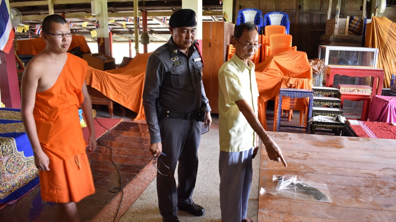 ด้าน นายขาว ตุลาทอง อายุ 76 ปี ไวยาวัจกร กล่าวว่า เมื่อช่วงเช้าขณะที่ตนกำลังจะเปิดประตูห้องเก็บของ พบว่ามีร่องรอยการงัดทำให้ลูกบิดประตูเสียหาย และประตูห้องเปิดออกมา จึงเข้าไปตรวจสอบภายในห้อง พบว่าตู้บริจาคเป็นตู้ไม้ สูงประมาณ 50 ซม. และกว้างประมาณ 40 ซม.หายไป พร้อมเงินสด จำนวนหนึ่งที่อยู่ในตู้บริจาคจำนวนเงินหลายพันบาท จึงรีบปรึกษากับพระลูกวัด และโทรแจ้งเจ้าหน้าที่ตำรวจ เบื้องต้น เจ้าหน้าที่ตำรวจพบว่ามีมีดทำครัวตกอยู่ในที่เกิดเหตุ คาดว่าเป็นของคนร้ายนำมาใช้ในการงัดประตูลูกบิด