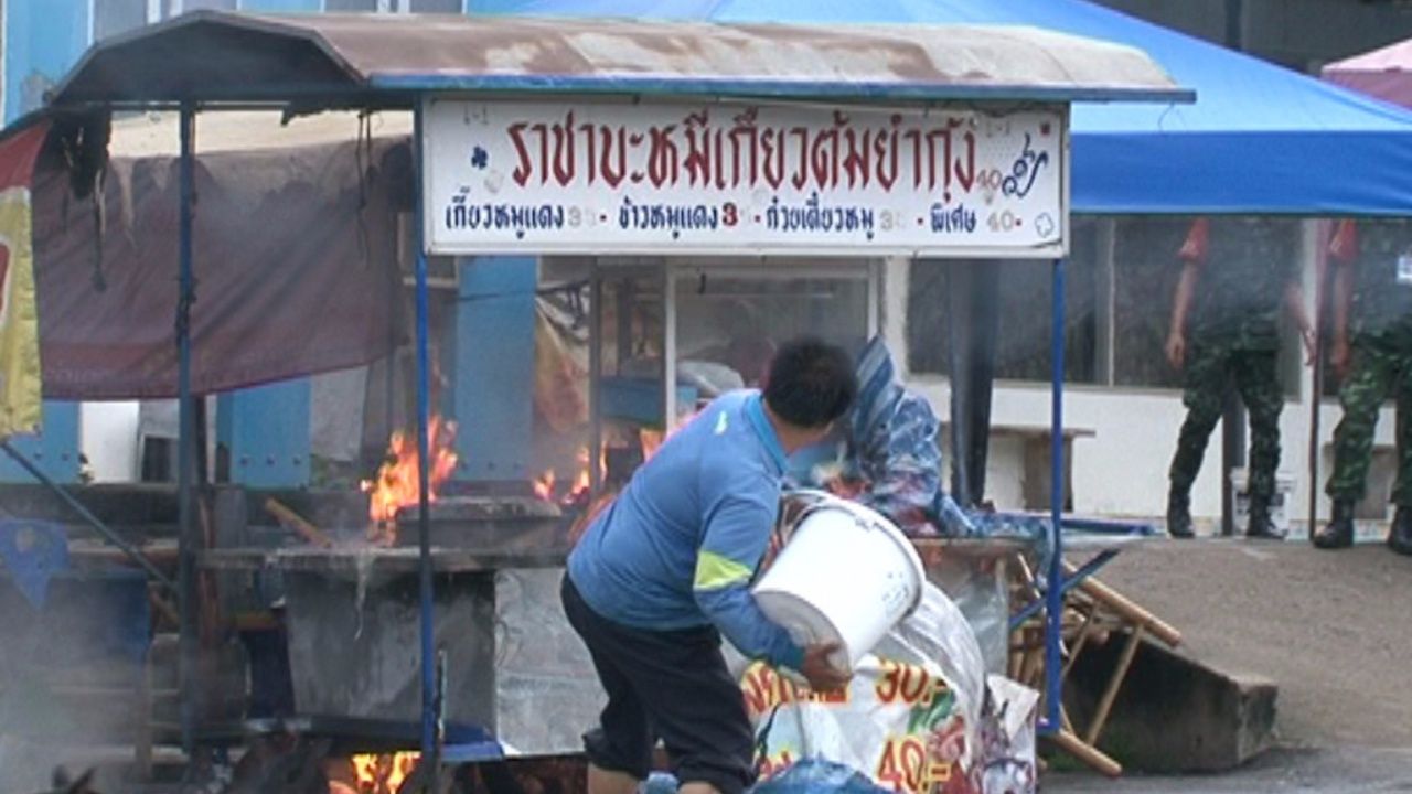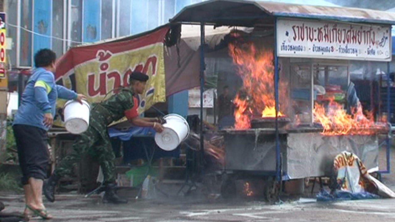 พบไฟกำลังลุกไหม้รถเข็นขายก๋วยเตี๋ยวด้านใต้ท้องรถ ซึ่งเป็นที่วางตั้งถังแก๊สหุงต้มไว้ ลุกไหม้ค่อนข้างรุนแรง มีเปลวเพลิงพุ่งออกจากถังแก๊สชาวบ้าน และทหารกองประจำการที่อยู่ด้านหน้าค่ายทหาร ช่วยกันหาน้ำมาสาดเพื่อจะดับไฟ แต่ไม่สามารถดับได้เนื่องจากแก๊สยังพุ่งออกจากถังมาตลอดเวลา เจ้าหน้าที่ทหารนายหนึ่งตัดสินใจเข้าไปปิดวาล์วถัง ซึ่งค่อนข้างเสี่ยงเพราะเปลวเพลิงค่อนข้างรุนแรง จนสามารถปิดวาล์วได้สำเร็จ ลากเอาถังแก๊สออกมา เพลิงจึงเริ่มสงบลง ก่อนจะควบคุมไว้ได้