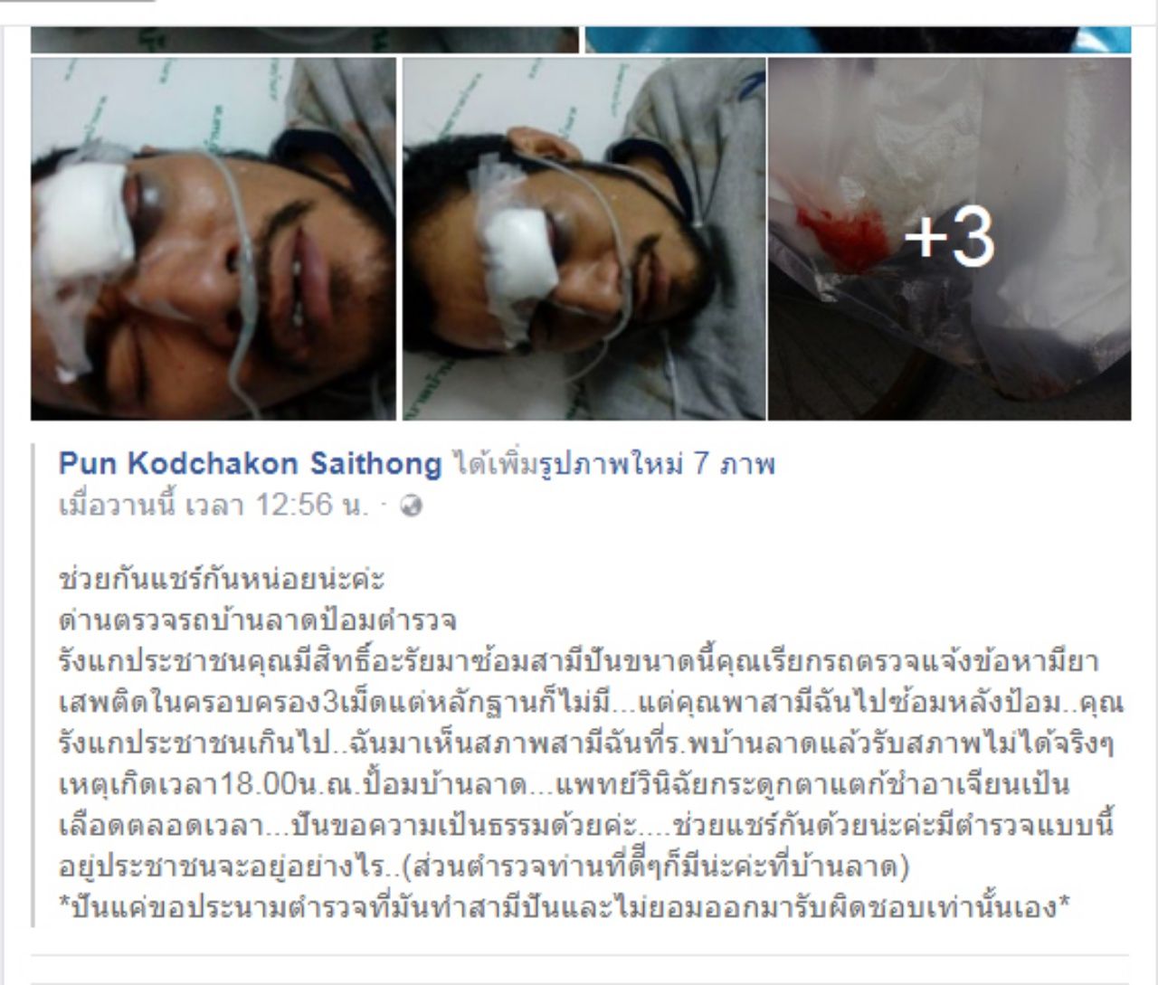 “ช่วยกันแชร์กันหน่อยน่ะค่ะ ด่านตรวจรถบ้านลาดป้อมตำรวจรังแกประชาชน คุณมีสิทธิ์อะไรมาซ้อมสามีปันขนาดนี้ คุณเรียกรถตรวจแจ้งข้อหามียาเสพติดในครอบครอง 3 เม็ด แต่หลักฐานก็ไม่มี...แต่คุณพาสามีฉันไปซ้อมหลังป้อม..คุณรังแกประชาชนเกินไป..ฉันมาเห็นสภาพสามีฉันที่ รพ.บ้านลาดแล้วรับสภาพไม่ได้จริงๆ