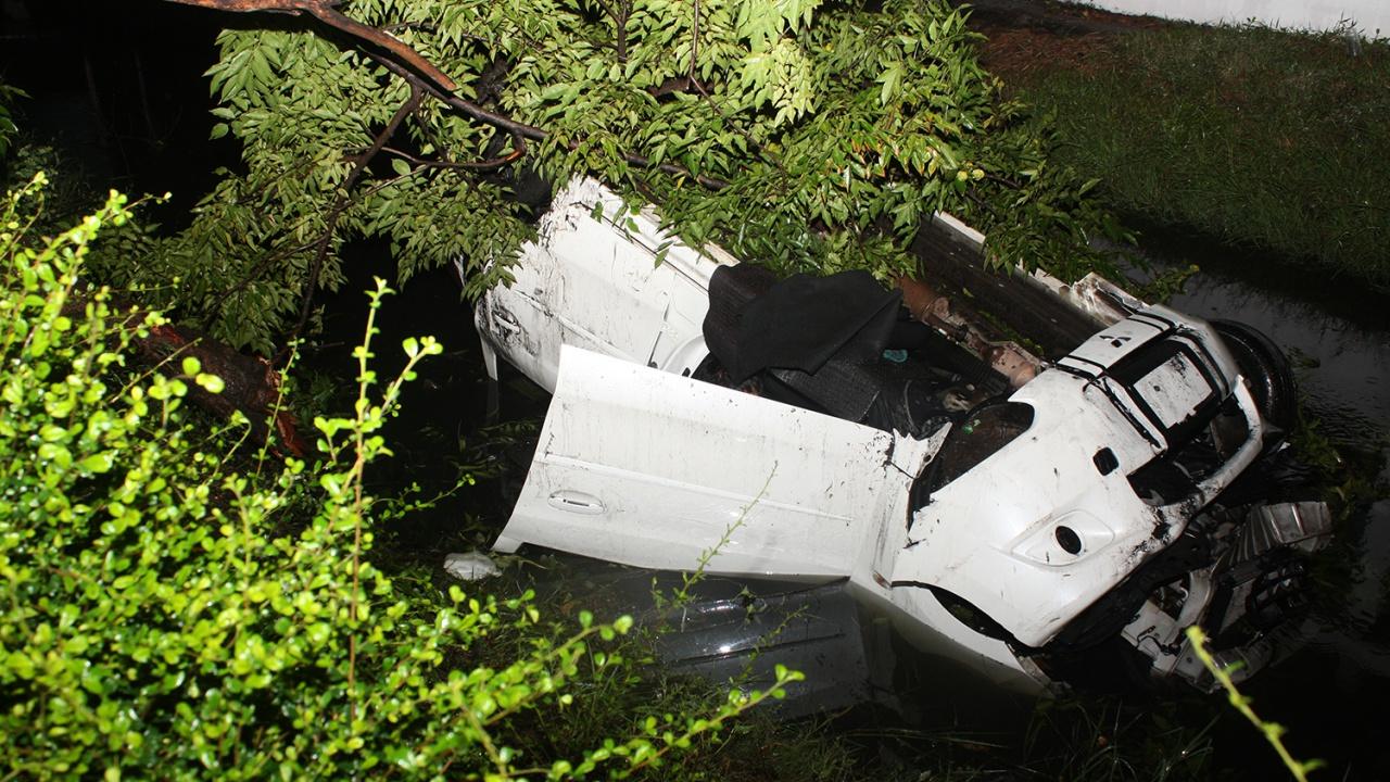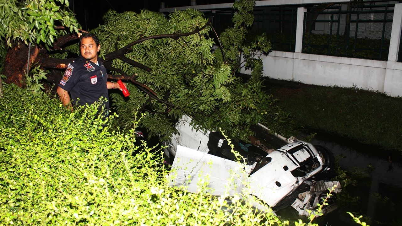 ที่เกิดเหตุบริเวณฟุตปาท พบต้นไม้ถูกชนจนหัก ส่วนในคลองระบายน้ำ พบรถเก๋งยี่ห้อมิตซูบิชิ มิราจ สีขาว หมายเลขทะเบียน ฆผ 2093 กรุงเทพมหานคร หงายท้องจมอยู่ในน้ำครึ่งคัน เจ้าหน้าที่ได้ลงช่วยนำร่างคนขับออกมาปฐมพยาบาล แต่พบว่า เสียชีวิตไปก่อนแล้ว ทราบชื่อต่อมาคือ นายภาณุพงศ์ เสนานุช อายุ 28 ปี สภาพศพคอหัก