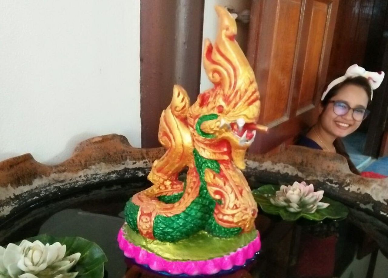 “เมื่อนำไปโพสต์ในเฟซบุ๊ก ปรากฏว่ามีคนทักมาว่า ทำไมเอาบายศรีพญานาคไปใส่บาตร จึงเข้าไปดูก็ตกใจขนลุกเลย เพราะของในถุงเหมือนพญานาคน้อยมาก ซึ่งจริงๆ แล้วในถุงคือ ขนมใส่ไส้ จากนั้นก็มีกลุ่มเพื่อนมาขอถามอายุ ถามบ้านเลขที่ เพื่อจะนำไปเสี่ยงโชคกันเป็นจำนวนมาก ซึ่งก็บอกว่าอาจจะเป็นความบังเอิญของมุมกล้องก็ได้ แต่ส่วนตัวนับถือองค์พญานาคอยู่แล้ว ส่วนภาพนี้เชื่อว่าองค์พญานาคน้อยอาจจะมาร่วมบุญใส่บาตรด้วยก็เป็นได้ และที่บ้านก็บูชาองค์พญานาคไว้ที่ในอ่างหน้าบ้านด้วย” น.ส.สิริรักษ์ กล่าว.