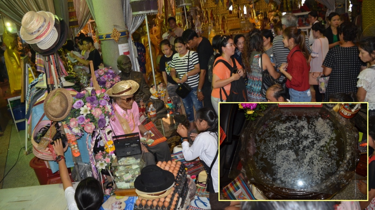สำหรับสิ่งที่นักเสี่ยงโชคให้ความสนใจมากที่สุดคือ หุ่นตาทองงิ้วราย ที่นั่งอยู่กลางศาลาการเปรียญ และมีโอ่งน้ำมนต์อยู่ด้านหน้าหุ่น ซึ่งจะมีหยดน้ำตาเทียนในอ่างให้เห็นเป็นเลขที่คนมักได้โชค ซึ่งโอ่งน้ำมนต์ศักดิ์สิทธิ์นี้ ในทุก 15 วัน พระสงฆ์จะทำพิธีสวดให้กับตาทองงิ้วราย เพื่อสะกดวิญญาณให้อยู่ ไม่ออกไปอาละวาดหลอกหลอนชาวบ้าน โดยจุดเทียนรอบโอ่งให้น้ำตาเทียนหยดขณะทำพิธี หยดเทียนจะลอยรวมกันเป็นเลข ชาวบ้านต่างฮือฮาล้อมดูกันจำนวนมาก บ้างก็ถ่ายรูปเก็บไว้เพื่อหาซื้อเลขเด็ดจากแผงลอตเตอรี่ บ้างก็ถ่ายรูปส่งให้เพื่อนฝูงไว้ลุ้นดู บ้างนำหมวก ผ้าขาวม้านาฬิกา มาถวายหุ่นตาทองอย่างไม่ขาดสาย เนื่องจากให้โชคลาภจึงต้องนำมาถวายตามที่บอกกล่าว