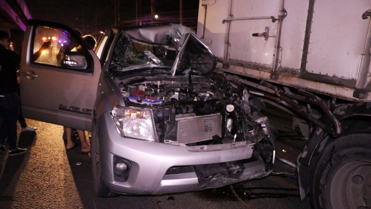 พบรถกระบะ นิสสัน นาวาร่า สีบอร์น ทะเบียน บม 3678 ฉะเชิงเทรา พุ่งชนท้าย รถบรรทุกหกล้อ ฮีโน่ สีขาว ทะบียน 77 – 2960 กรุงเทพมหานคร ของนายณัฐพล กาญจนพัฒน์ อายุ 25 ปี ที่ขับอยู่เลนซ้ายเต็มแรงทำให้ นายจำรัส บุญเกิด อายุ 34 ปี คนขับและเพื่อนที่นั่งมาในรถรวม 4 คน ได้รับบาดเจ็บ หน่วยกู้ภัยฉะเชิงเทรา ทำการปฐมพยาบาลก่อนนำส่งโรงพยาบาลจุฬารัตน์ 11