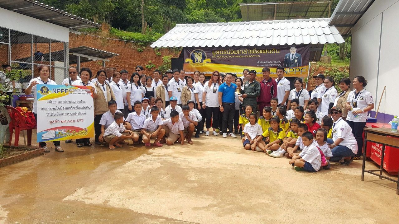 นอกจากนี้ มูลนิธิฯ ยังได้มอบงบประมาณในการก่อสร้างแท่นประดิษฐานพระบรมสาทิสลักษณ์ และอาคาร “ศาลาร่วมใจน้อมเกล้าเพื่อแผ่นดิน” ไว้เพื่อเป็นสาธารณประโยชน์ อีกด้วย โดย นายพันธ์เทพห์สักดิน ทองแดง ประธานมูลนิธิน้อมเกล้าเพื่อแผ่นดิน กล่าวว่า โครงการเกิบนี้เพื่อน้อง เป็นพันธกิจของทางมูลนิธิน้อมเกล้าเพื่อแผ่นดิน ซึ่งจะมีพันธกิจในการช่วยเหลือเด็กตามแนวชายแดน ซึ่งทางมูลนิธิฯ ได้เข้ามาทำกิจกรรมที่นี่ 2 วัน 1 คืน ระหว่างวันที่ 23-24 ก.ย. 2560.