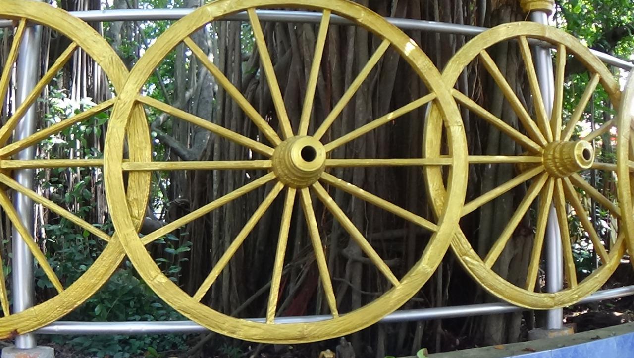 วันที่ 25 ก.ย. ชาวบ้านจังหวัดอ่างทอง ฮือฮาล้อเกวียนสีทอง 44 ล้อ ล้อมรอบต้นไทรยักษ์ อนุสรณ์พระครูโฆษิต โชติธรรม หลวงพ่อบุญลือ ฐานโชโต ที่บริเวณวัดคำหยาด ตำบลคำหยาด อำเภอโพธิ์ทอง จังหวัดอ่างทอง ลักษณะเป็นล้อเกวียนขนาดใหญ่ เส้นผ่าศูนย์กลาง 1.30 เมตร ทาเป็นสีทองสวยงาม วางตกแต่งอยู่โดยรอบต้นไทรยักษ์ที่มีการก่อปูนปูกระเบื้องโดยรอบต้นไทร แล้วตกแต่งด้วยล้อเกวียนสีทองโดยรอบต้นไทร โดยวงล้อเกวียนเป็นล้อเกวียนที่เลิกใช้งานแล้ว จึงนำมาซ่อมแซมพร้อมตกแต่งทาสีทองเพิ่มความสวยงาม