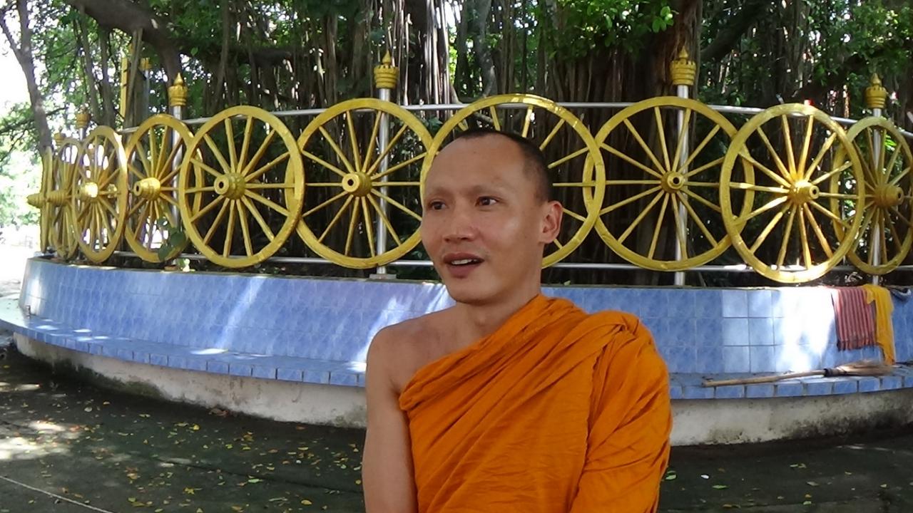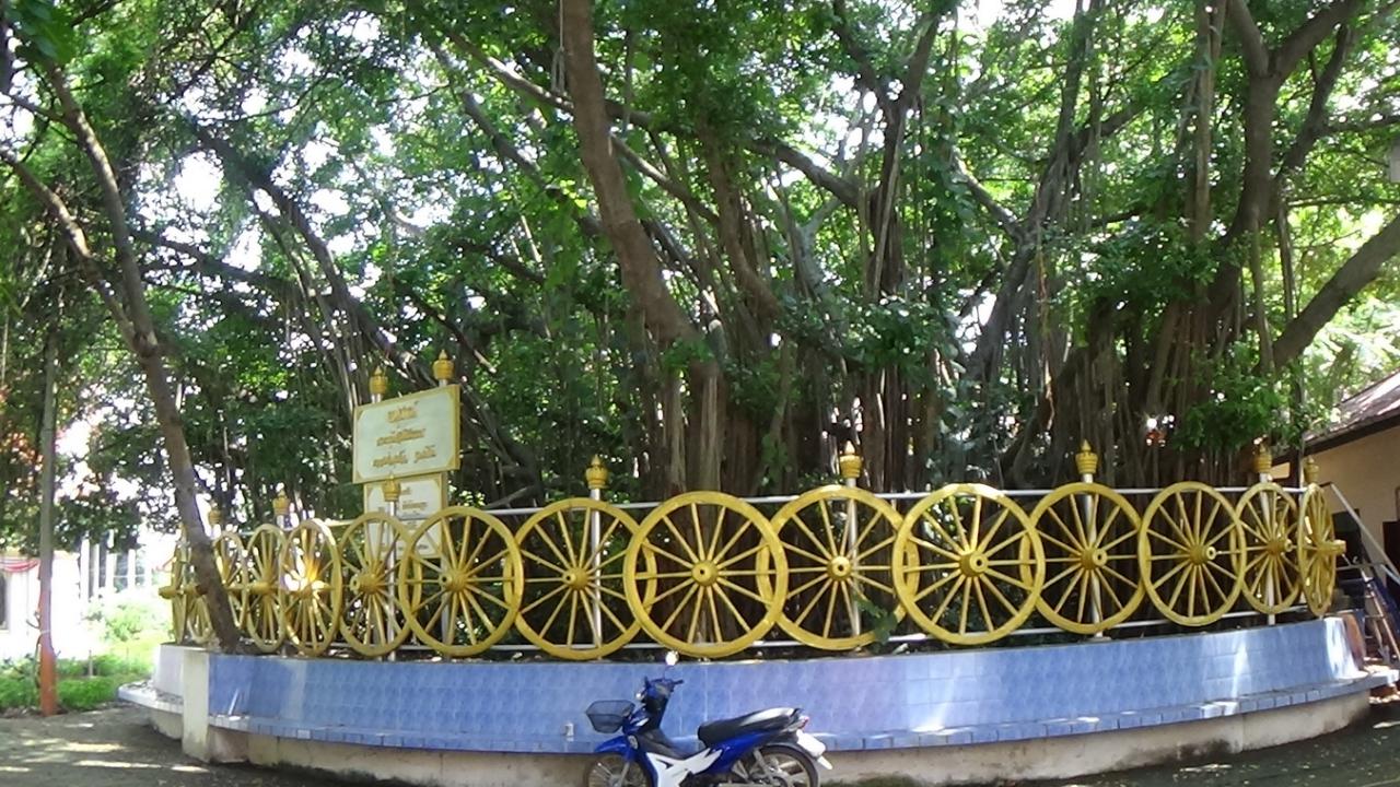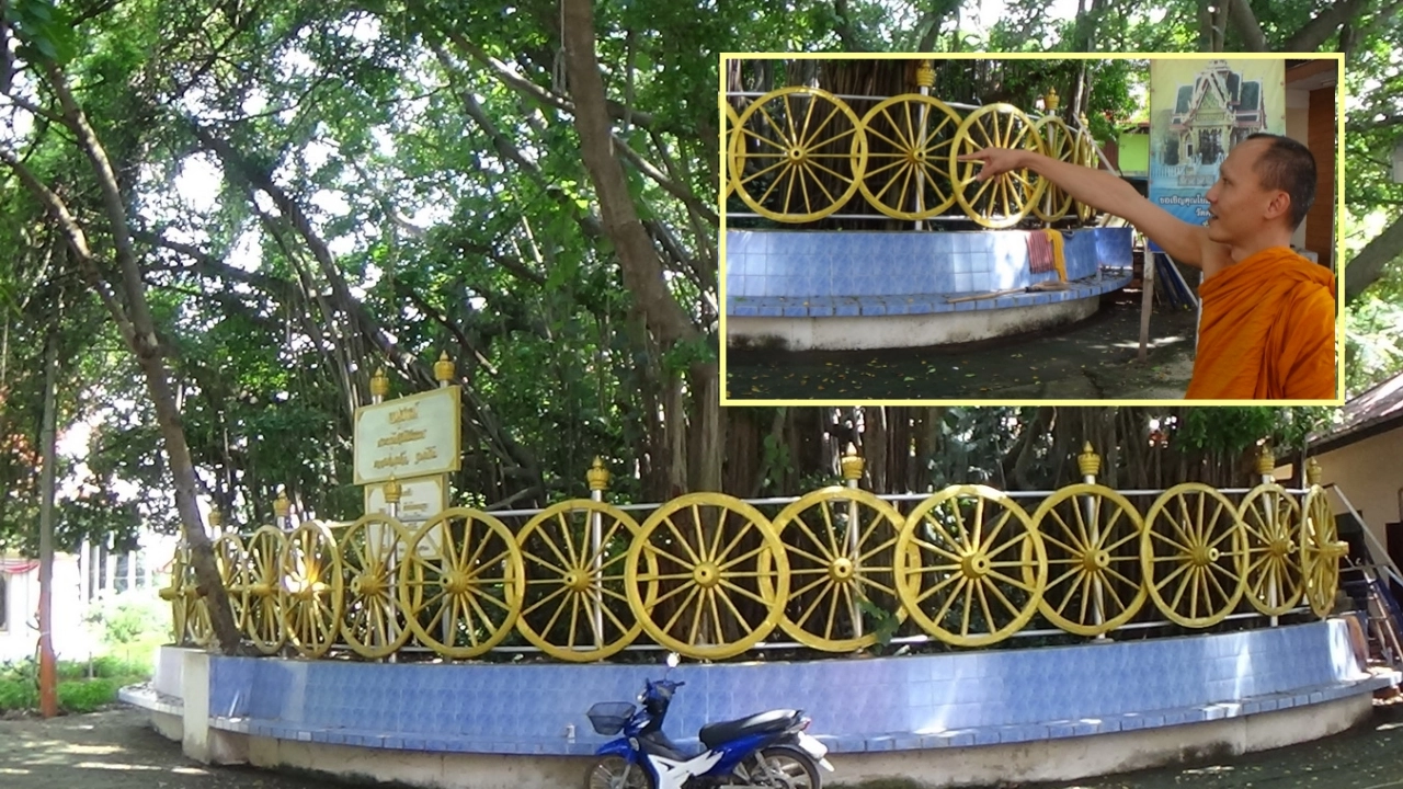 ล้อเกวียนสีทอง 44 ล้อ ล้อมรอบต้นไทรยักษ์วัดดัง อ่างทอง ถูกสร้างตามกุศโลบายอดีตเจ้าอาวาส เพื่อขุดบ่อฝังวัตถุมงคลแล้วปลูกต้นไม้ทับไว้ ญาติโยมร่วมปรับภูมิทัศน์เป็นอนุสรณ์ นำเลข 44 เสี่ยงโชค...