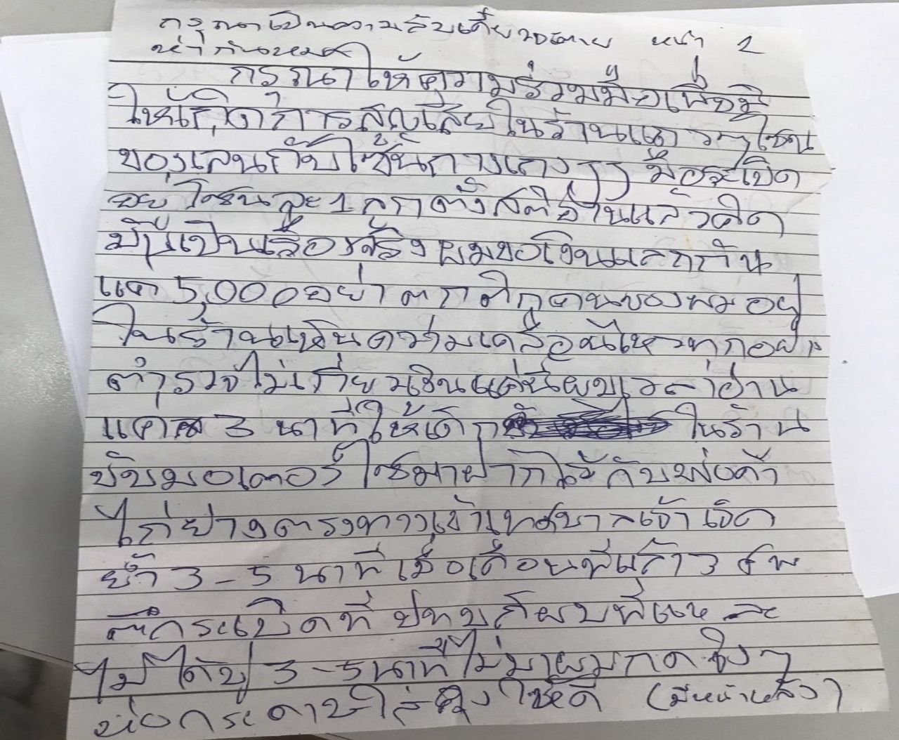 นางประคอง ยรรประยูร 47 ปี เจ้าของร้าน กล่าวว่า ตนเองเปิดร้านขายของตามปกติ จากนั้นได้มีคนขี่ จยย.รับจ้างเอาจดหมายมาส่งให้ จ่าหน้าซองเขียนคำว่า "ด่วนที่สุด" เปิดดูภายในซองจดหมายพบแผ่นกระดาษ 1 แผ่น เขียนด้วยปากกาดำ ข้อความว่า "กรุณาเก็บเป็นความลับ เดี๋ยวจะตายห่ากัน กรุณาให้ความร่วมมือ มิให้เกิดความสูญเสียในร้าน แถวโซนของเล่นกับโซนกางเกง มีระเบิดอยู่โซนละลูก ตั้งสติอ่านแล้วคิด มันเป็นเรื่องจริง ผมขอเงินแลกกัน แค่ 5,000 บาทอย่าตุกติก คนอย่างผมอยู่ในร้านเห็นความเคลื่อนไหวทุกอย่าง ตำรวจไม่เกี่ยว เงินแค่นี้ผมให้เวลาแค่ 3 นาที ให้เด็กในร้านขับมอเตอร์ไซค์เอาไปฝากไว้ที่พ่อค้าขายไก่ย่าง ตรงทางเข้าเทศบาลเจ้าเจ็ด ย้ำ 3-5 นาที เมื่อเดือนที่แล้ว 3 ศพ ตึกระเบิดที่ปทุมก็ผมนี่แหละ ไม่ได้ขู่ 3-5 นาที ไม่มาผมกดจริงๆ ห่อกระดาษใส่ถุงให้ดี จะล็อกรหัสทันที แล้วจะโทรไปบอกว่าระเบิดอยู่ตรงไหน หวังว่าคงให้ความร่วมมือนะ เงินแค่ 5,000 บาท เศษเงินของคุณชัดๆ แค่นี้ ไม่มากดจริงๆ เมื่อกดแล้วอีก 5 นาทีจะทำ 1 ลูก แล้วอีก 5 นาที ลูกที่ 2 จะระเบิด ให้คิดว่าเป็นเรื่องจริง โจรอย่างผมตรัสแล้วไม่คืนคำ"