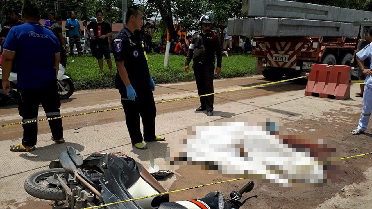 รถพ่วง 18 ล้อชนทับหัวสาวลูกจ้างโรงงานทำศาลพระภูมิสมองกระจายตายสยองพร้อมหลานชาย 2 ศพ ผู้ตายขี่รถจักรยานยนต์กลับจากธุระในตัวเมืองมุ่งหน้ากลับบ้าน มีหลานชายวัย 13 ปี นั่งซ้อนท้าย ส่วนลูกสาววัยขวบเศษนั่งมาด้านหน้า ระหว่างทางถนนกำลังซ่อมแซมผิวจราจร พื้นถนนขรุขระแถมมีน้ำท่วมขัง ทำให้รถเสียหลักล้มร่างกระเด็นตกกลางถนน จังหวะเดียวกันรถพ่วงขับแซงตีประกบ ทำให้คนขับมองไม่เห็นถูกล้อลูกพ่วงชนทับดับอนาถพร้อมกัน ส่วนลูกสาวกระเด็นตกริมถนน เนื้อตัวถลอกบาดเจ็บเล็กน้อยรอดหวุดหวิด