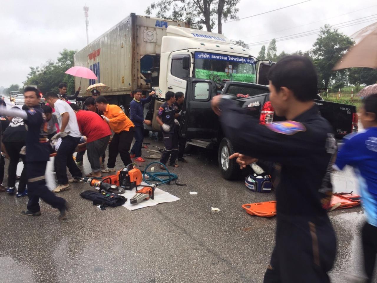 ส่วนที่กระบะหลัง พบสัมภาระกระจัดกระจาย นอกจากนี้ ยังมีผู้ที่ได้รับบาดเจ็บอีก 5 ราย เจ้าหน้าที่กู้ภัยเร่งนำส่งโรงพยาบาลวัฒนานคร อย่างเร่งด่วน ก่อนเสียชีวิตเพิ่ม 1 ราย คือ น.ส.กาญจนา ไกรสวรรค์
