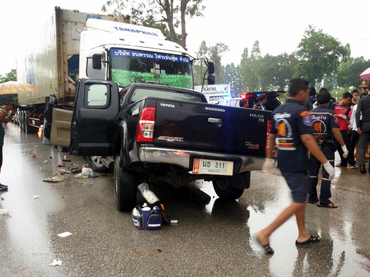 จากการสอบถามทราบว่า ขณะเกิดเหตุ มีฝนตกลงมา โดยรถปิกอัพวิ่งมาจากด้านอำเภอวัฒนานคร กำลังจะกลับอีสาน ด้วยความเร็ว พยายามจะแซงรถอีกคันแต่ไม่พ้น ขณะเดียวกัน รถพ่วงคันดังกล่าวได้วิ่งสวนขึ้นมา เป็นเหตุให้ประสานงากันอย่างจัง จนมีผู้ได้รับบาดเจ็บ และเสียชีวิตดังกล่าว.