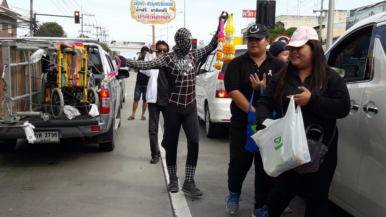 มาร์ค มาลัยทอง ในคราบของฮีโร่สไปเดอร์แมน เผยว่า ตนมีอาชีพขายพวงมาลัยอยู่บริเวณนี้มานานหลายปี จนกระทั่งเมื่อวันที่ 4 กันยายน 2560 ที่ผ่านมา ขณะที่ตนขายพวงมาลัยอยู่ฝั่งขาเข้า กทม. พบเห็นอุบัติเหตุรถกระบะเฉี่ยวชนกับรถจักรยานยนต์ช่วงขาล่องใต้จนล้มลงและมีผู้ได้รับบาดเจ็บตนจึงรีบวิ่งไปกันรถคันอื่นๆ ที่วิ่งตามหลังมา เพราะเกรงว่าผู้บาดเจ็บจะถูกเหยียบซ้ำ ภายหลังเจ้าหน้าท่ตำรวจ สภ.ท่ายาง ตรวจสอบจากกล้องวงจรปิด จึงพบว่าตนวิ่งเข้าไปช่วยแล้วนำคลิปดังกล่าวมาโพสในเฟวบุ๊ก จนมีชาวเน็ตเข้ามาดูและพากันชื่นชมจำนวนหลายหมื่นคน และมีผู้มีจิตเมตตานำเงินมามอบให้กับตนรวมเกือบ 5 พันบาท ตนจึงจัดสินใจนำเงินเหล่านั้นมาซื้ออุปกรณ์ร้อยพวงมาลัย เพื่อนำมาแจกจ่ายให้กับประชาชนที่เดินทางสัญจรไปมา
