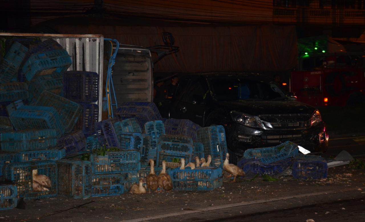 ขณะที่ชาวบ้านและเจ้าหน้าที่ต้องช่วยกันต้อนเป็ดที่วิ่งหนีเพราะความตกใจ อยู่บนถนนซึ่งมีรถวิ่งผ่านไปมา เกรงว่าจะถูกรถทับตาย โดยเป็ดบางตัวตกลงมากระแทกพื้นอย่างแรงคอหักเสียชีวิต และมีขนเป็ดลอยฟุ้งว่อนเต็มถนน พร้อมกลิ่นเป็ดเหม็นคละคลุ้งไปทั่ว นอกจากนี้บริเวณหน้ารถบรรทุกยังพบรถยนต์กระบะ ยี่ห้ออีซูซุ แคป สีดำ ทะเบียน บพ 5654 ชัยภูมิ สภาพรถถูกชนเสียหาย