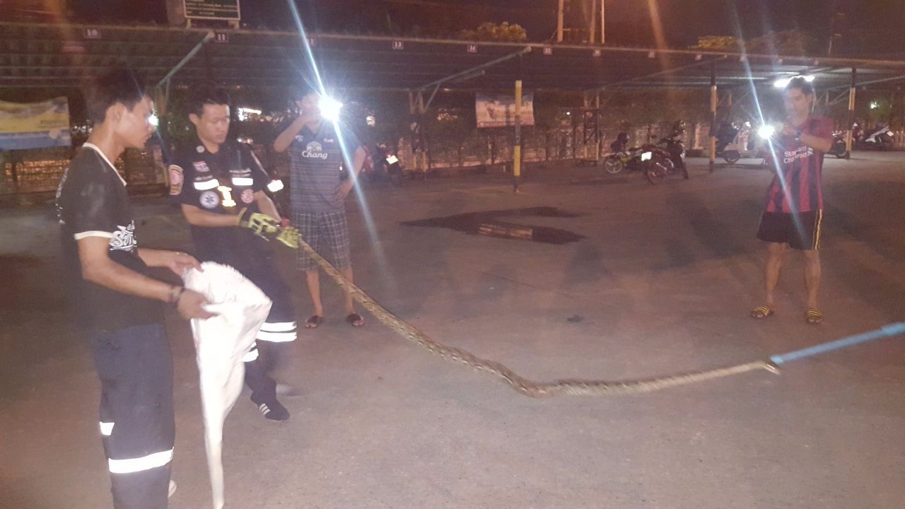 ที่เกิดเหตุบริเวณลานจอดรถด้านหน้าบริษัทพบรถยนต์กระบะ โตโยต้า รุ่น รีโว่ สีบรอนซ์เงิน หมายเลขทะเบียน 1 ฒ ภ 62 กทม. จอดอยู่ โดย มี นายพนม อุปถัมภ์ อายุ 40 ปี หัวหน้ารปภ.ของบริษัทยืนรอเจ้าหน้าที่กู้ภัยก่อนเปิดฝากระโปรงรถชี้ให้ดูงูเหลือมขนาดใหญ่ความยาวประมาณ 4 เมตร นอนขดอยู่ในห้องเครื่อง เจ้าหน้าที่จึงใช้อุปกรณ์จับงูเข้าจับอยู่นานกว่า 3 ชั่วโมงแต่ไม่สามารถจับตัวได้เนื่องจากงูเลื้อยหลบหนีซ่อนตัวรอบเครื่องยนต์รถ