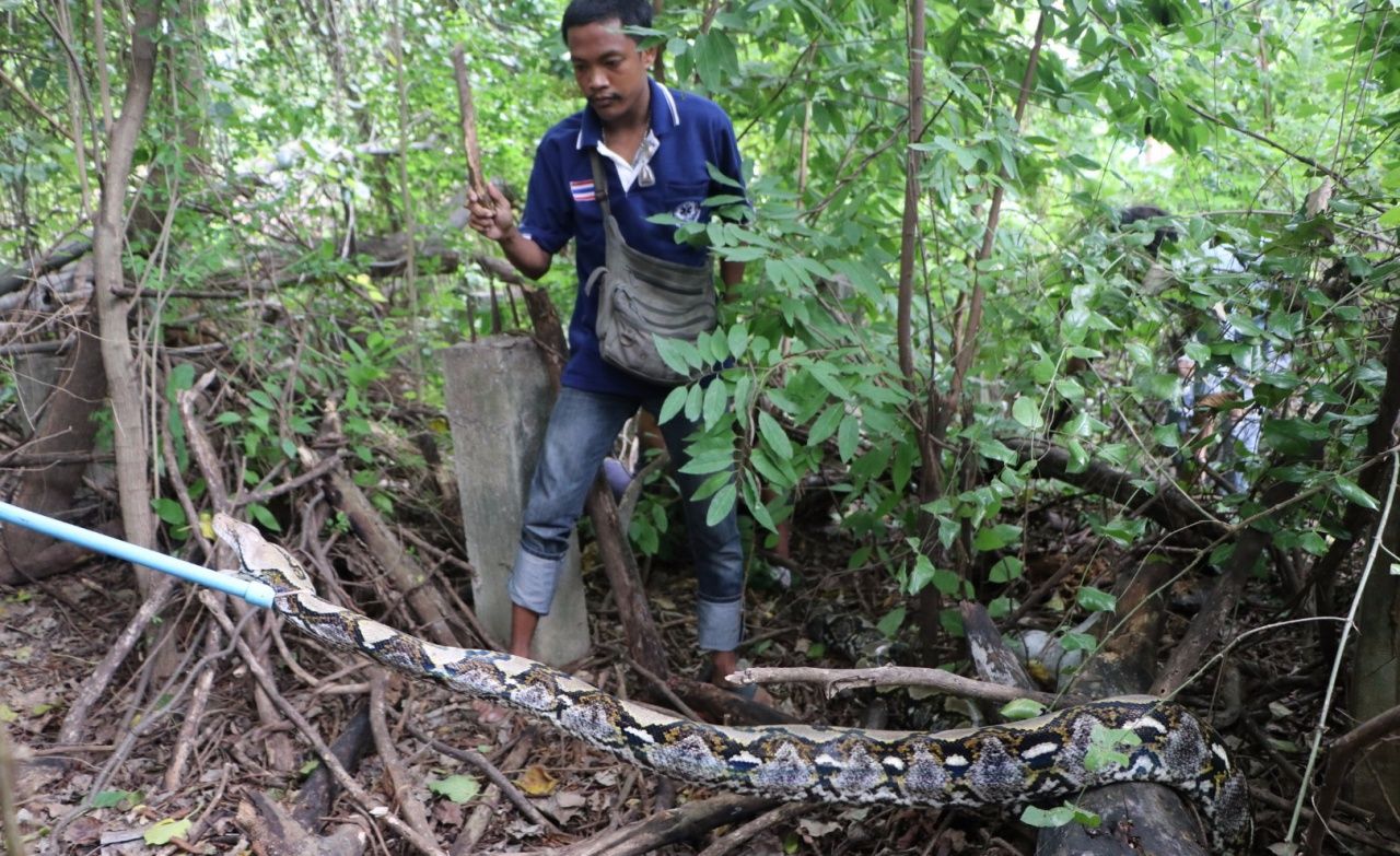 เมื่อไปถึง พบว่างูเหลือมได้รัดสุนัขจนตายแล้วเลื้อยหลบอยู่ในพงหญ้า เจ้าหน้าที่ต้องใช้มีดฟันต้นหญ้าปิดล้อมเอาไว้ แต่พอจะใช้เชือกคล้องงูเหลือมได้พุ่งเข้าใส่ ต้องตั้งสติก่อนใช้บ่วงเชือกคล้องคอนำตัวงูเหลือม และซากสุนัขออกมา