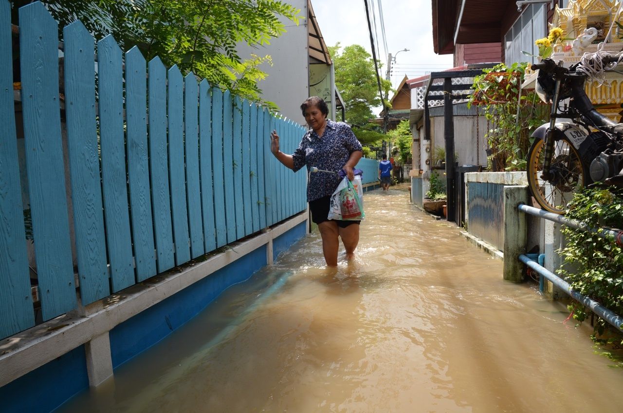 เกาะเกร็ด ประเดิมแล้วน้ำท่วมชุมชนวัดฉิมพลีหลายสิบหลัง ชาวบ้านต้องเดินลุยน้ำไกลร่วม 400 เมตร แม่ค้าของฝากของที่ระลึกเป็นห่วง กลัวนักท่องเที่ยวไม่กล้ามาเที่ยว ของจะขายไม่ได้...