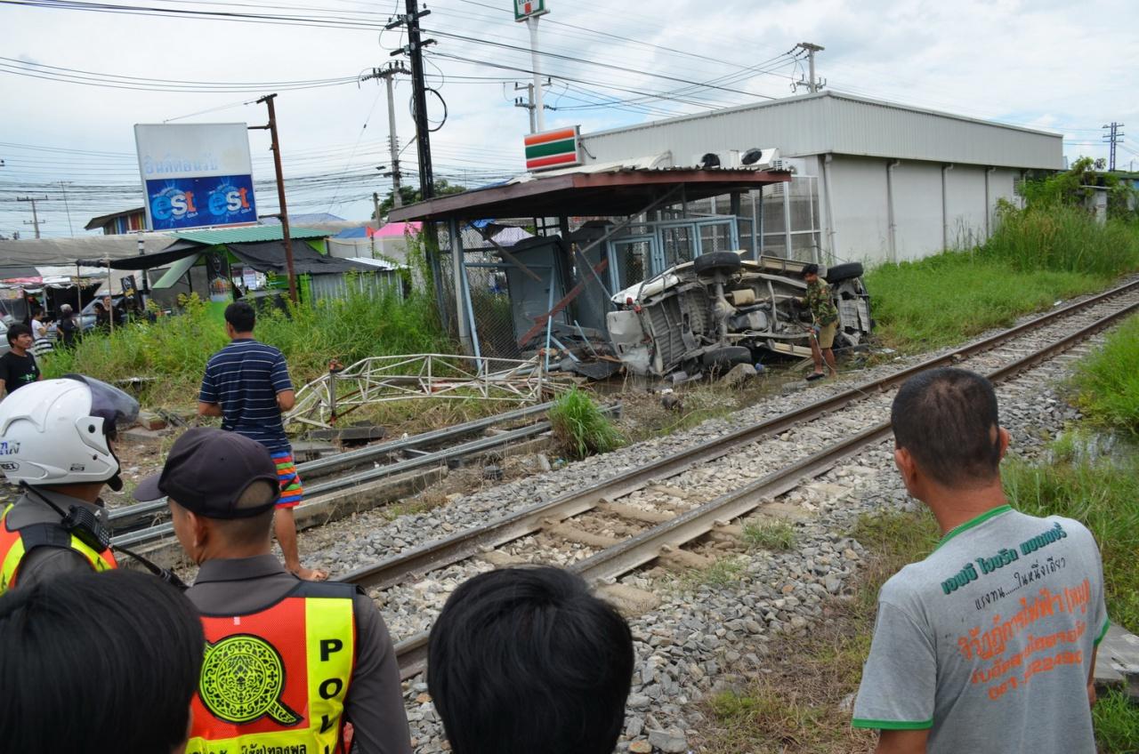 ที่เกิดเหตุพบชาวบ้านยืนมุงดูกันจำนวนมาก โดยพบรถยนต์กระบะ มิตซูบิชิ แค็บ สีขาว หมายเลขทะเบียน บห 4249 นครปฐม ตะแคงข้างพิงอยู่กับแผงควบคุมเครื่องไฟข้างรางรถไฟ สภาพรถพังยับเยินทั้งคัน ห่างจากรถเกิดเหตุ 10 เมตร พบที่กั้นรางรถไฟถูกชนหักงอเสียหาย ห่างออกไปอีก 20 เมตร พบรถไฟดีเซลรางขบวน 252 ประจวบคีรีขันธ์-ธนบุรี ที่วิ่งรับผู้โดยสารจาก จ.ประจวบคีรีขันธ์ จะเข้า กทม.จอดอยู่ สภาพรถด้านหน้าเสียหายเล็กน้อย สามารถวิ่งต่อไปส่งผู้โดยสารได้