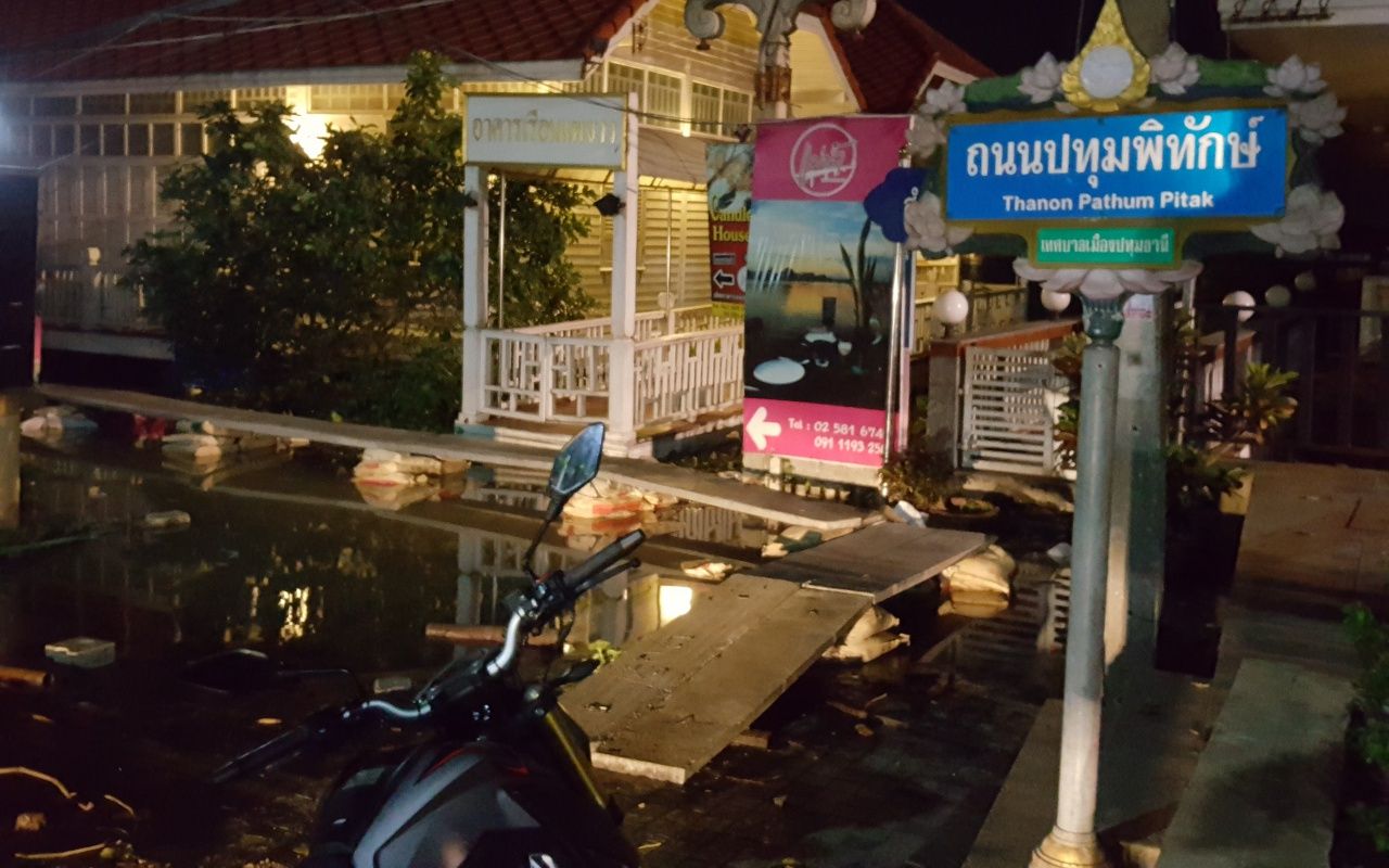 นอกจากนี้บริเวณถนนปทุมพิทักษ์ อ.เมือง จ.ปทุมธานี ซึ่งอยู่ด้านหลังสำนักงานกาชาด จ.ปทุมธานี น้ำได้เอ่อท่วมถนนทางเดินเท้า ทำให้ชาวบ้านและร้านอาหารที่ปลูกติดแม่น้ำเจ้าพระยา ได้รับความเดือดร้อน ต้องทำสะพานทางเดินด้วยการนำกระสอบทรายมาวางเป็นระยะ แล้วใช้แผ่นปูนวางทาบเป็นแนวยาว เพื่อใช้ในการเดินทางเข้าออก.