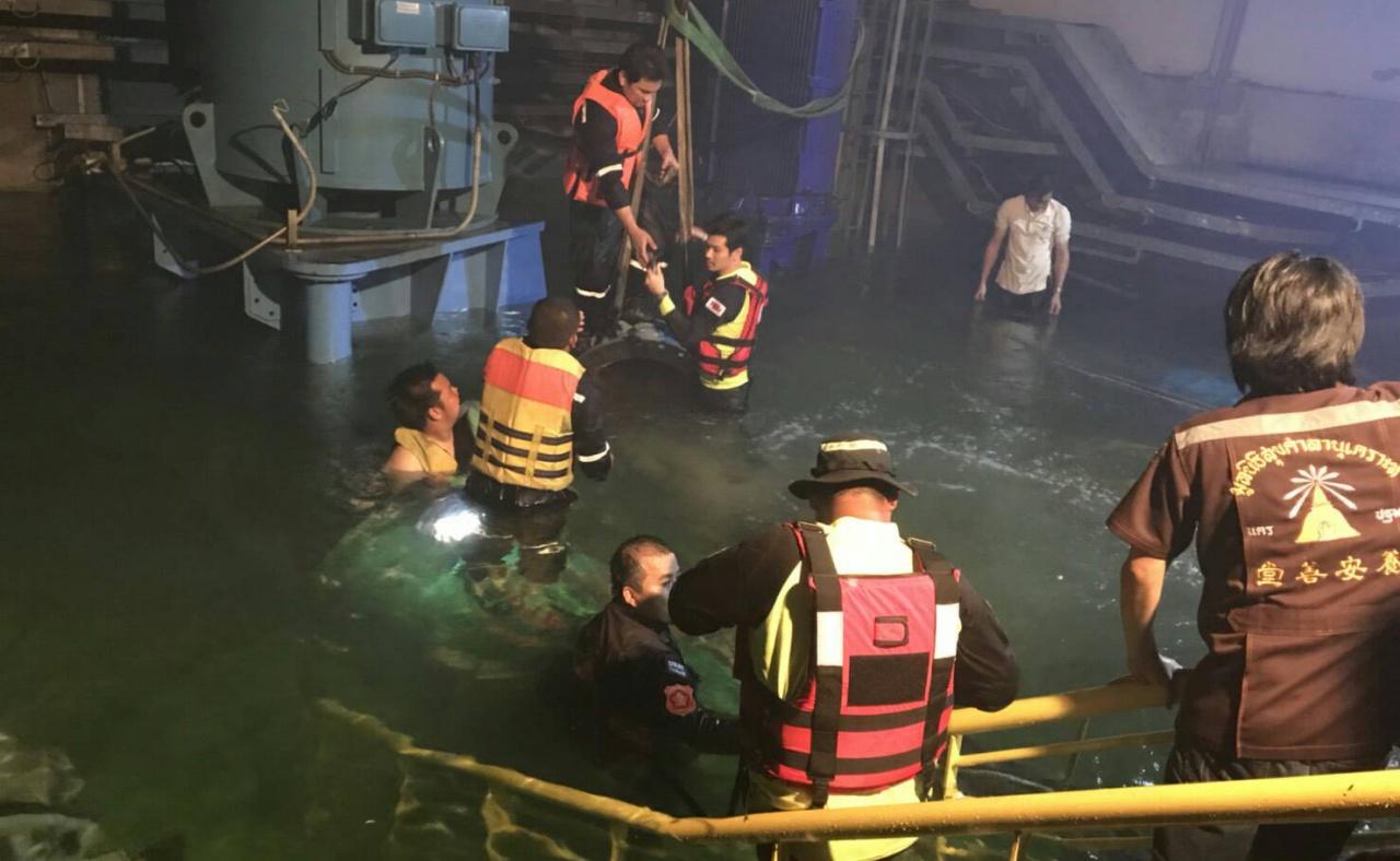 ขณะเดียวกันนักประดาน้ำ ได้ลงไปสำรวจพบ ชาย 1 รายจมอยู่ที่ระดับน้ำลึก 4 เมตร ติดอยู่ใต้ท่อ บริเวณทางลาดลงบันใด ชั้นล่างสุด สวมเสื้อสีเลือดหมู กางเกงยีนส์ขายาว แต่ยังไม่สามารถนำศพขึ้นมาได้