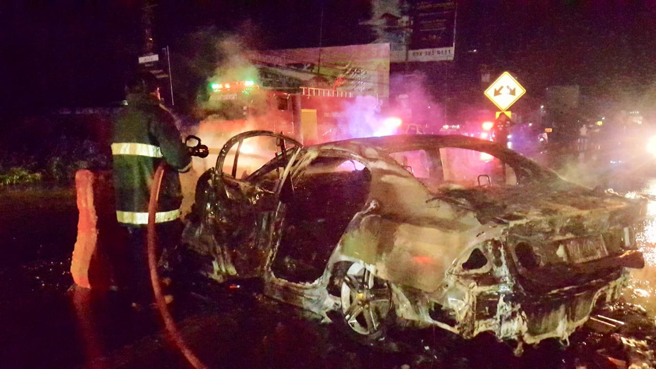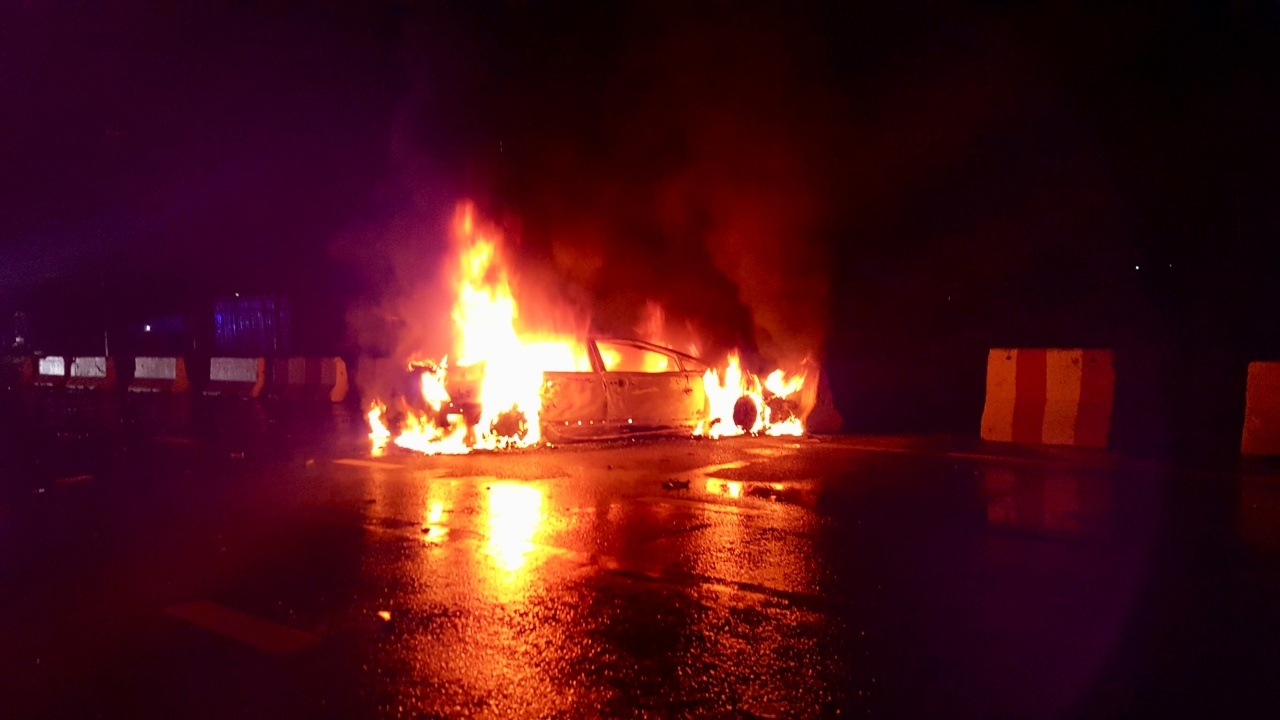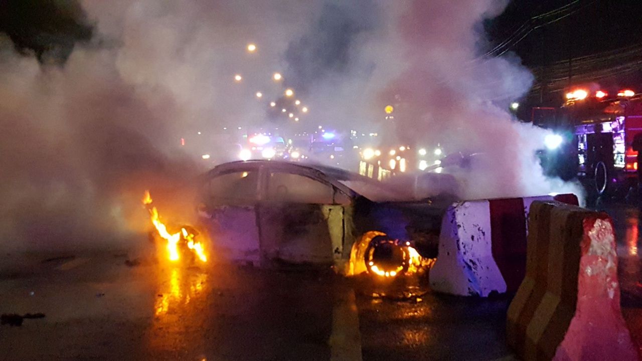 เมื่อเวลา 02.00 น. วันที่ 22 ต.ค. ร.ต.อ.ณัฐพล ดวงสุริยา รอง สว.(สอบสวน) สภ.คลองข่อย อ.ปากเกร็ด จ.นนทบุรี รับแจ้งเหตุ มีรถเก๋งชนแบริเออร์กั้นขอบทาง ไฟลุกไหม้ บริเวณเชิงสะพานข้ามคลองบางบัวทอง หมู่ 2 ถนนราชพฤกษ์ ฝั่งขาออก ต.ท่าอิฐ ไปสอบสวน พบไฟกำลังลุกไหม้ รถเก๋งยี่ห้อ ฮอนด้า ซีวิค สีดำ หมายเลขทะเบียน ชฎ 4841 กทม. โดยมีเจ้าหน้าที่ดับเพลิงของเทศบาลตำบลบางพลับ ช่วยกันระดมฉีดน้ำสกัดไฟ ซึ่งใช้เวลาประมาณ 30 นาที สามารถควบคุมสถานะการณ์ไว้ได้ ซึ่งรถถูกไฟเผาวอดได้รับความเสียหายทั้งคัน