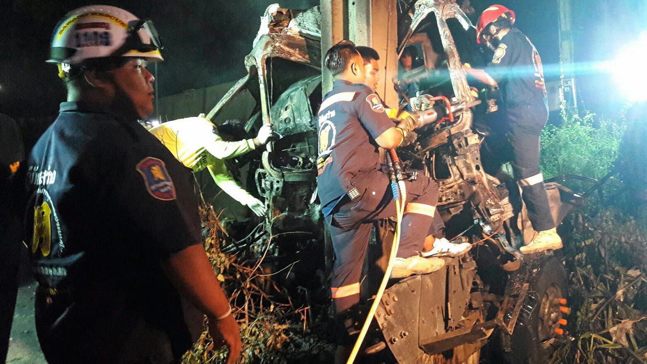 หน่วยกู้ภัยงัดซากรถพ่วงบรรทุกตู้คอนเทนเนอร์ที่พุ่งชนเสาไฟฟ้าริมถนนเพชรเกษมขาขึ้น กม.ที่ 127-128 อ.เขาย้อย จ.เพชรบุรี เกิดไฟลุกไหม้ย่างสดคนขับกับภรรยาที่นั่งมาในรถดับสยอง 2 ศพ.