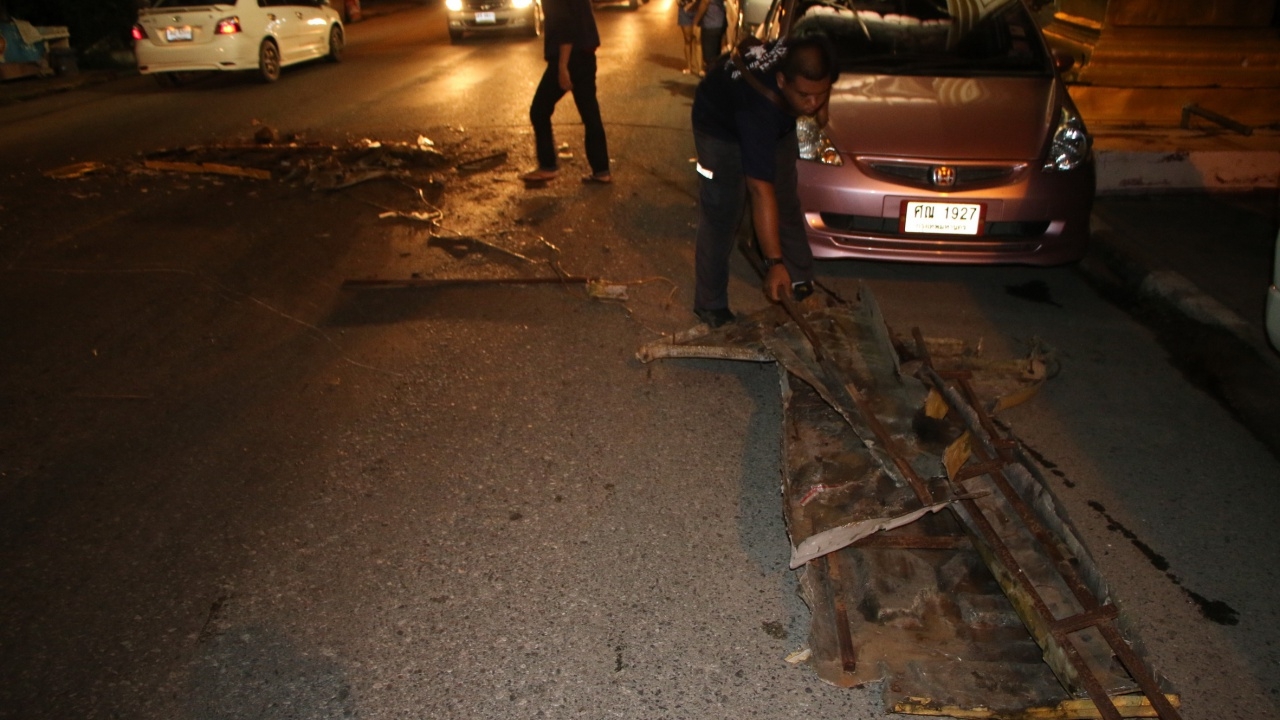 เมื่อเวลา 23.00 น. วันที่ 10 พ.ย. หน่วยกู้ภัยฉะเชิงเทรา ได้รับแจ้งเหตุโครงเหล็กซุ้มซึ่งทำคร่อมถนน ของเทศบาลตำบลบางวัว เกิดมีโครงเหล็กที่ประดับอยู่ตกลงมาด้านล่าง บริเวณตลาดบางวัว ถนนจรัญยานนท์ หมู่ 1 ต.บางวัว อ.บางปะกง จ.ฉะเชิงเทรา จึงประสานอาสาสมัครหน่วยกู้ภัยฉะเชิงเทรา รุดตรวจสอบที่เกิดเหตุ พบโครงเหล็ก และไฟเบอร์ขนาดใหญ่ จำนวน 4 ชิ้น ตกลงมากองอยู่บนถนน ก่อนที่ชาวบ้านจะช่วยกันเก็บแอบเข้าข้างทาง ซึ่งยังมีโคมไฟที่ส่องซุ้มประตูหักงอลงมา ทำให้รถบรรทุกที่มีความสูงเฉี่ยวชนจนเป็นหวาดเสียวเกรงว่า จะทำให้ป้ายซุ้มตกลงมาเพิ่มเติม จนเวลาผ่านไป 1 ชั่วโมง ได้มีชาวบ้านไปตามรถกระเช้าจากกองช่างของเทศบาลตำบลบางวัว มีแก้ไขโคมไฟ โดยนำเชือกผูกกับเหล็กที่ยึดโคมไฟเอาไว้ชั่วคราว เพื่อไม่ให้เกิดความอันตรายกับรถที่สัญจรผ่านไปมา ส่วนเรื่องชิ้นส่วนที่จะตกลงมาอีกจะต้องรอการแก้ไขต่อไป ซึ่งชาวบ้านหวั่นจะมีโครงเหล็กร่วงลงมาเพิ่มจึง วอนให้รีบแก้ไขทันทีเพื่อความปลอดภัยของชาวบ้าน
