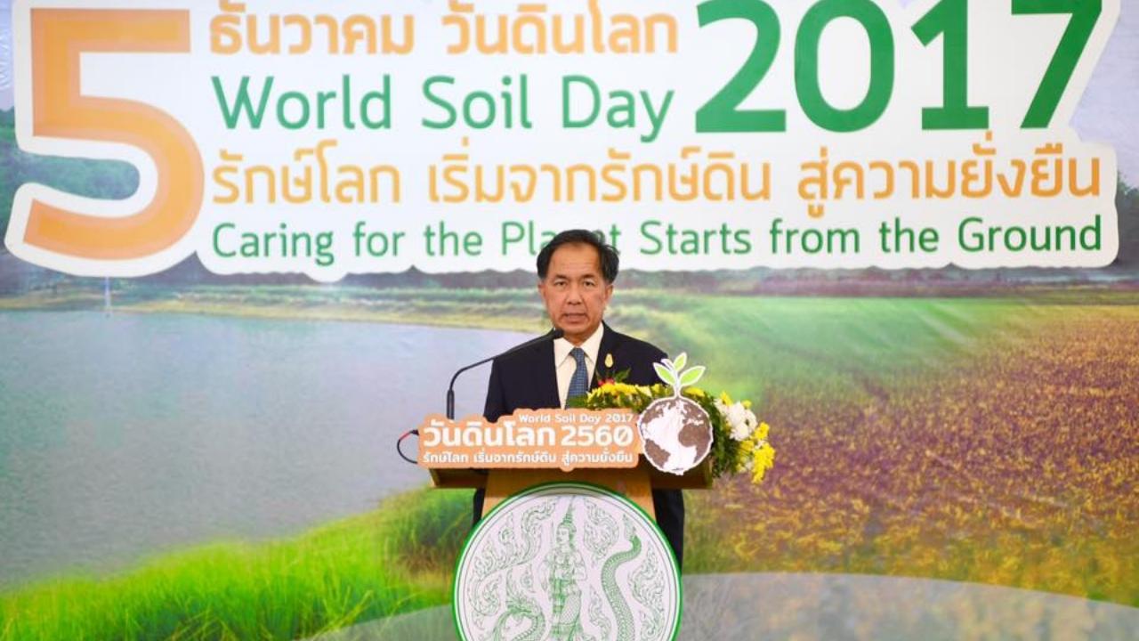 ที่ศูนย์ศึกษาวิธีการฟื้นฟูที่ดินเสื่อมโทรมเขาชะงุ้ม นายกฤษฎา บุญราช รมว.เกษตรและสหกรณ์ เปิดเผยภายหลังเปิดงานวันดินโลก ปี 2560 ภายใต้หัวข้อ "Caring for the Planet Starts from the Ground : รักษ์โลก เริ่มจากรักษ์ดิน สู่ความยั่งยืน" ที่จัดขึ้นระหว่างวันที่ 4 - 6 ธันวาคม 2560 ณ ศูนย์ศึกษาวิธีการฟื้นฟูที่ดินเสื่อมโทรมเขาชะงุ้ม อันเนื่องมาจากพระราชดำริ อ.โพธาราม จ.ราชบุรี ว่า กระทรวงเกษตรและสหกรณ์ โดยกรมพัฒนาที่ดิน กำหนดจัดงานวันดินโลกเพื่อน้อมรำลึกในพระมหากรุณาธิคุณพระบาทสมเด็จพระปรมินทรมหาภูมิพลอดุลยเดช บรมนาถบพิตร และเผยแพร่สืบสานพระราชปณิธานในการพัฒนาทรัพยากรดินและน้ำให้เกิดความอุดมสมบูรณ์ สามารถทำการเกษตรที่สร้างความมั่นคงทางด้านอาหาร และเป็นการอนุรักษ์ระบบนิเวศตามธรรมชาติให้เกิดความยั่งยืน ซึ่งเป็นการจัดงานเฉลิมฉลองวันดินโลกอย่างเป็นทางการ ครั้งที่ 4 เพื่อน้อมรำลึกถึงพระมหากรุณาธิคุณ และเชิดชูพระเกียรติยศในฐานะทรงเป็นนักวิทยาศาสตร์ดินเพื่อมนุษยธรรมของพระบาทสมเด็จพระปรมินทรมหาภูมิพลอดุลยเดช รวมทั้งเพื่อสร้างการรับรู้และความตระหนักในความสำคัญของทรัพยากรดินให้สาธารณชนรับทราบ และช่วยกันดูแลรักษาอย่างถูกวิธี