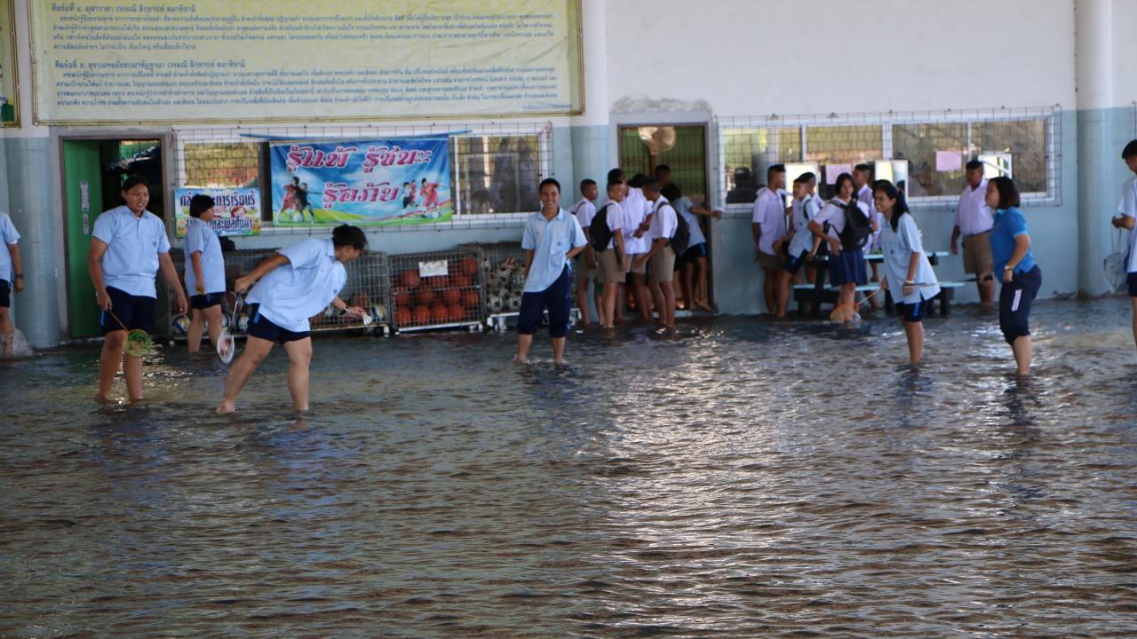 ขณะเดียวกัน ที่โรงเรียนบางปะกงบวรวิทยายน หมู่ 13 ต.บางปะกง อ.บางปะกง จ.ฉะเชิงเทรา ตั้งแต่ช่วง 07.30 น. ได้เกิดปรากฏการณ์น้ำทะเลหนุนสูงทำให้น้ำในแม่น้ำบางปะกงหลากเข้าท่วมพื้นที่โรงเรียนสูงในระดับ 10-50 ซม. นักเรียนที่จะเรียนพลศึกษา ไม่สามารถทำการเรียนการสอนได้ บางส่วนต้องหยุดเรียน เพราะหากจะเปลี่ยนห้องเรียนนักเรียนต้องถอดรองเท้า ถุงเท้า เดินลุยน้ำเพื่อไปเรียนวิชาต่อไป อีกทั้งยังมีตะขาบหนีน้ำลอยขึ้นมาเป็นจำนวนมาก ทำให้นักเรียนและครูต้องเดินอย่างระมัดระวังอันตรายจากสัตว์มีพิษต่างๆ โดยในพื้นที่บางปะกงมีบ้านเรือนประชาชน วัด จำนวนมากได้รับผลกระทบจากน้ำทะเลหนุนในครั้งนี้