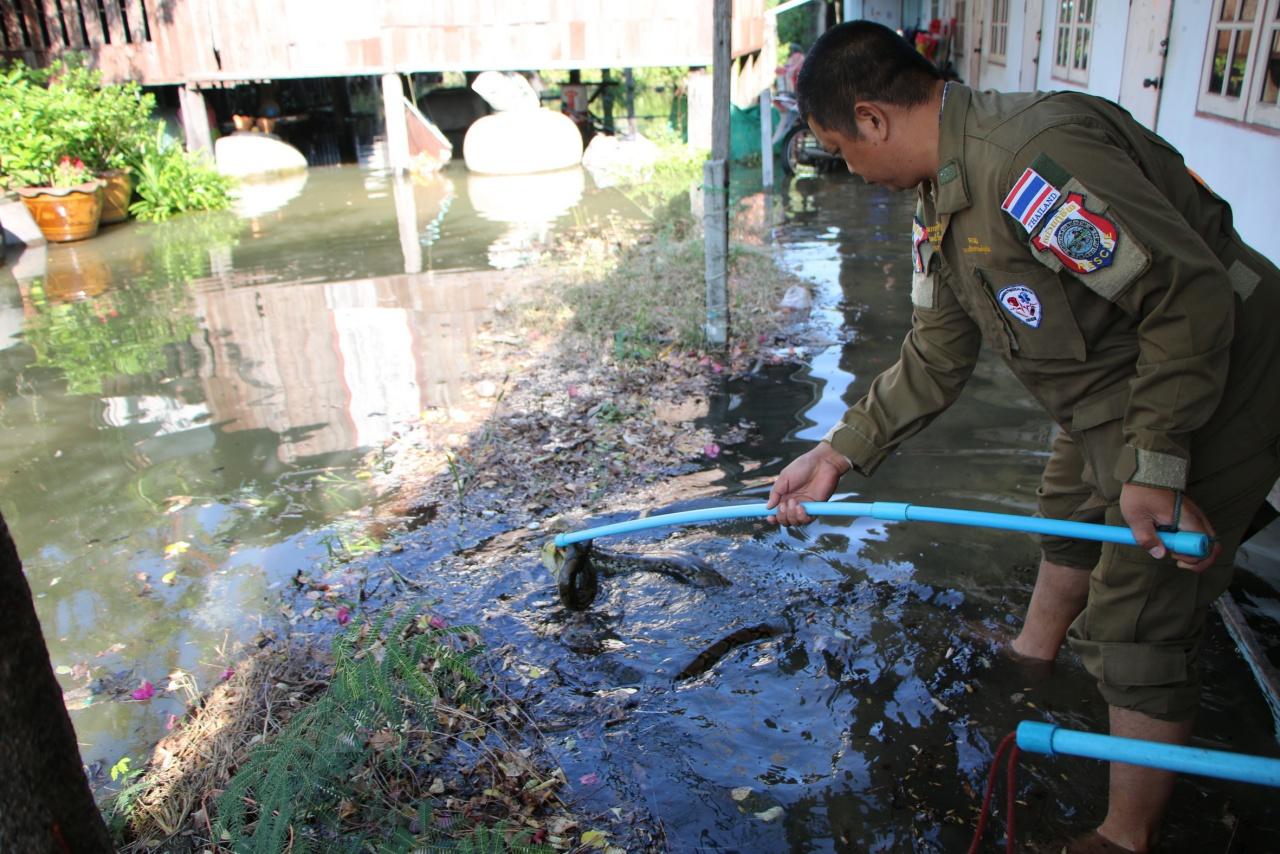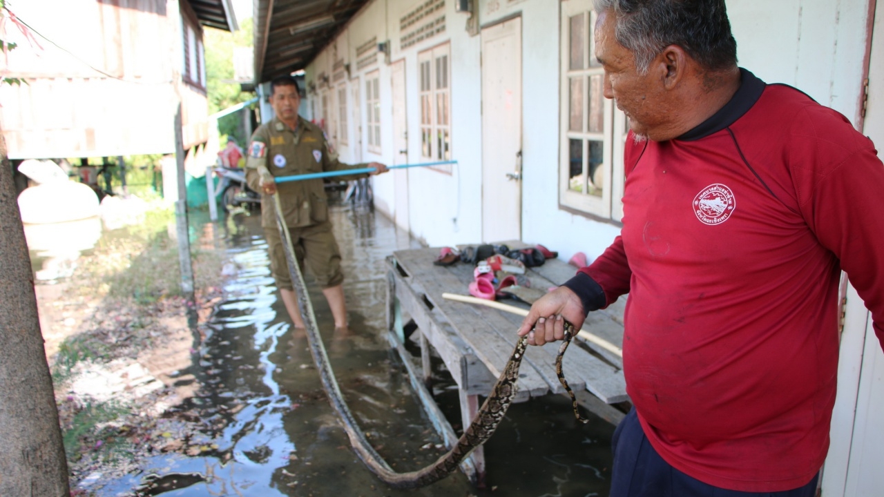 ต่อมา หน่วยกู้ภัยเทศบาลตำบลท่าข้าม ได้รับแจ้งจาก นางประไพ อนุรพันธุ์ อายุ 66 ปี ว่าพบงูเหลือมขนาดใหญ่ลอยมากับน้ำท่วม จึงนำกำลังพร้อมอุปกรณ์เข้าตรวจสอบพบว่างูเหลือมซุกตัวอยู่ในน้ำที่ท่วมบริเวณห้องแถวเลขที่ 32/4 หมู่ 8 ต.ท่าข้าม อ.บางปะกง จึงใช้เชือกคล้องคอ เป็นงูเหลือมยาวประมาณ 4 เมตร โดยนางประไพ เผยว่า ขณะที่น้ำทะเลหนุนสูง ตนพยายามเดินลุยน้ำเพื่อจะเข้าไปดูของภายในห้อง ระหว่างนั้นมองไม่เห็นงูเหลือมที่กำลังเลื้อยเข้าหา โชคดีที่เพื่อนบ้านนั้นเห็นก่อนจะรีบวิ่งมาดึงตัวออกมา ก่อนจะโดนงูเหลือมฉก.
