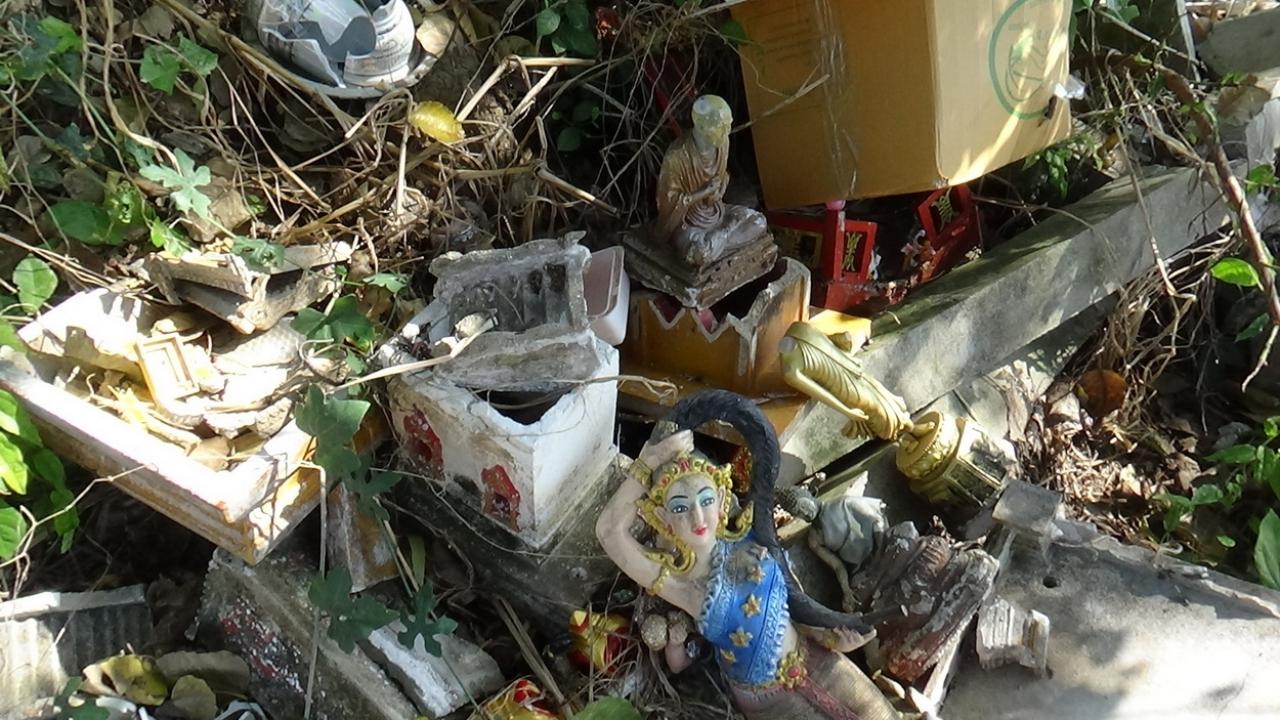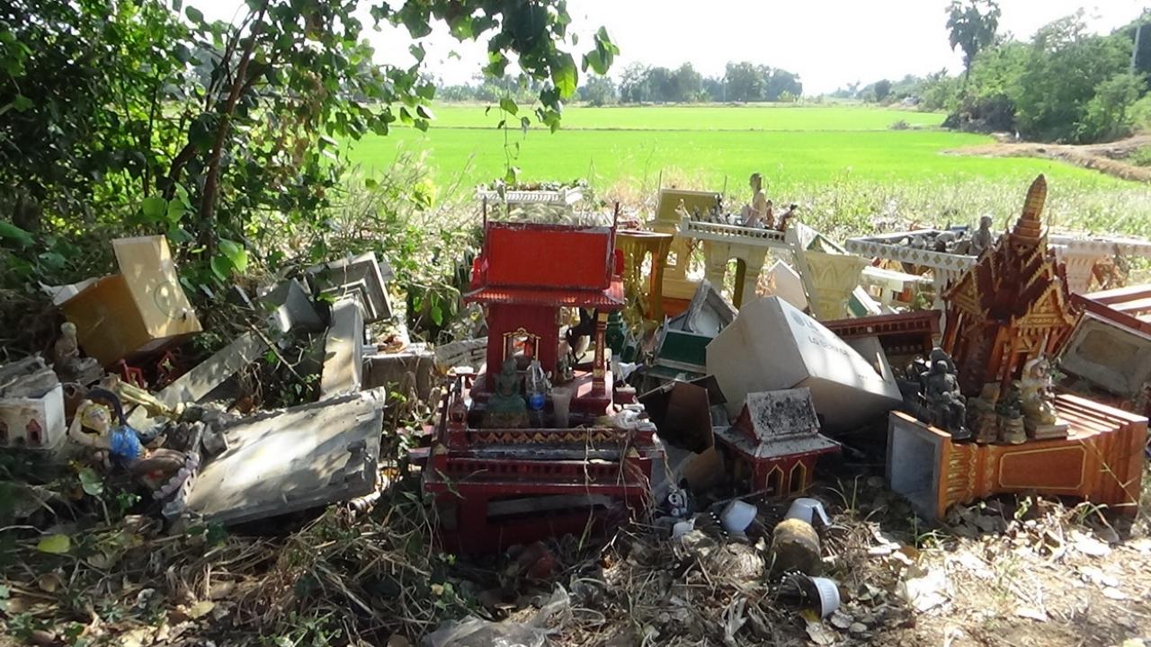 ถนนสุดสะพรึง! ชาวบ้านวอนขอ อย่านำซากศาลพระภูมิ วัตถุมงคลเสียหายกองทิ้งริมถนนโคนต้นโพธิ์ จ.อ่างทอง สร้างความหวาดผวา คนขับรถผ่านไปมา แม้มีการเก็บกวาดแล้ว 1 ครั้ง ไม่นานนักนำมากองทิ้งใหม่