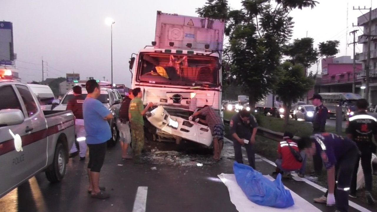 เมื่อเวลาประมาณ 05.30 น. วันที่ 13 ธันวาคม 2560 ร.ต.ท.ยุทธปวีร์ นวลพงศ์ รองสารวัตรสอบสวน สภ.เมืองสมุทรสาคร รับแจ้งมีอุบัติเหตุรถคอนเทนเนอร์ชนกัน 3 คัน บนถนนพระราม 2 ช่องทางด่วน ขาออกกรุงเทพฯ หลักกิโลเมตรที่ 25 + 650 ต.มหาชัย อ.เมือง จ.สมุทรสาคร มีผู้เสียชีวิตกับผู้บาดเจ็บติดภายใน จึงรุดไปตรวจสอบพร้อมด้วยเจ้าหน้าที่มูลนิธิการกุศลสมุทรสาคร และหน่วยกู้ชีพโรงพยาบาลมหาชัย1