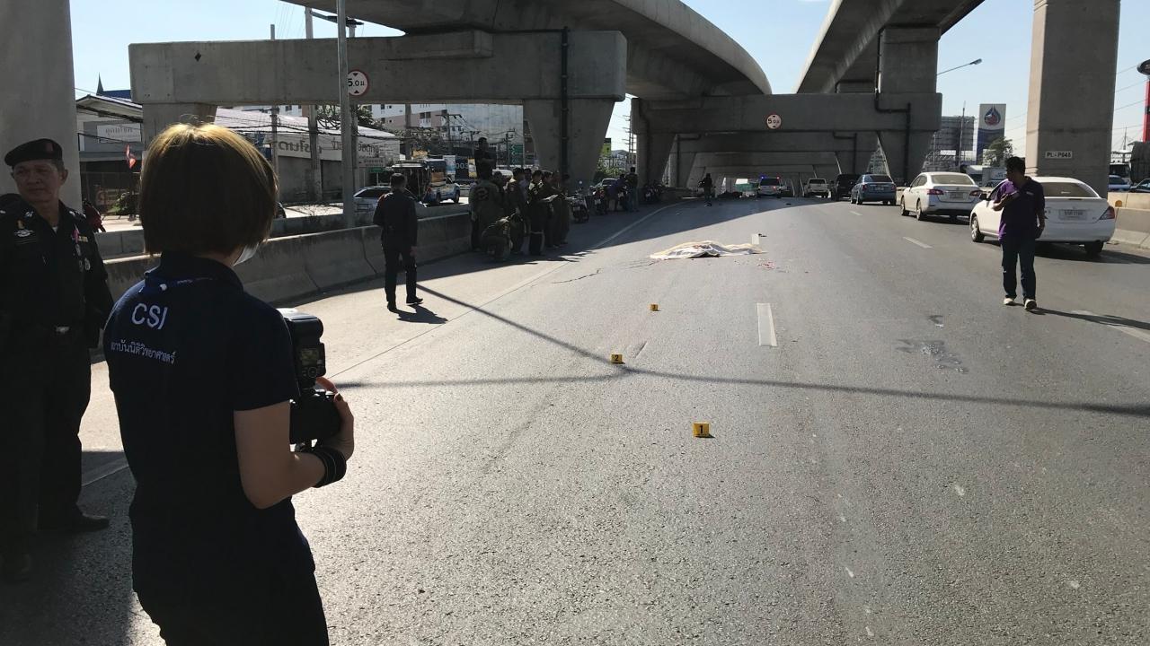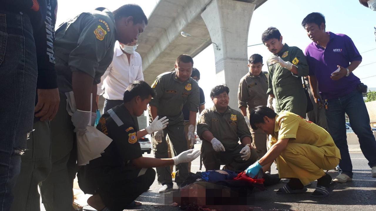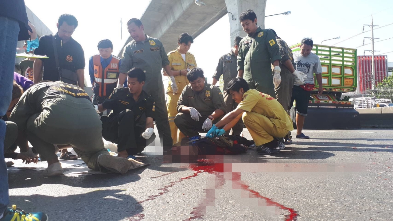 หนุ่มเมืองนนท์ควบจยย.คู่ใจ ถูกรถบรรทุกเฉี่ยวล้มร่างปลิว เคราะห์ซ้ำ รถบรรทุกน้ำมันวิ่งตามมา ทับร่างสมองเละ เหตุเกิดบนถนนกาญจนาภิเษกฝั่งขาเข้ากรุงเทพ เชิงสะพานข้ามคลองถนน