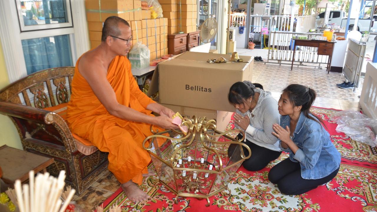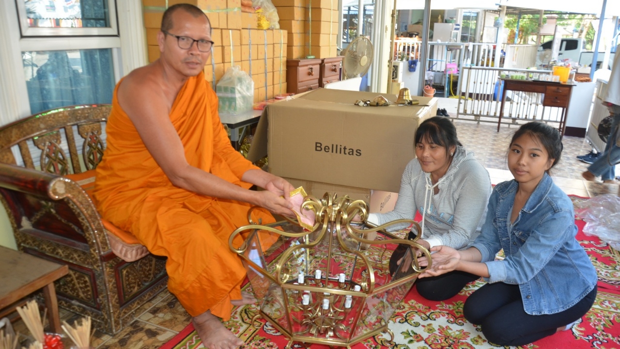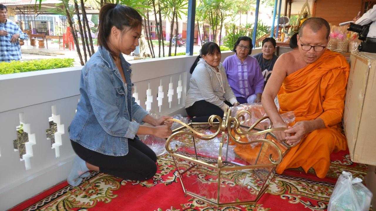 นางประคอง กิบสัน เปิดเผยว่า ทราบข่าวจากญาติที่บ้านเกิดว่าที่วัดกำลังจะมีงานฝังลูกนิมิต จึงได้ติดต่อกับทางเจ้าอาวาสว่ามาช่วยงานและร่วมทำบุญ ตนทราบว่าโบสถ์เพิ่งสร้างเสร็จ ยังไม่มีโคมไฟภายใน จึงได้สั่งซื้อโคมไฟแชนเดอเรีย จำนวน 3 ชุด ราคารวม 2 แสนบาท มาถวายเพื่อติดตั้งภายในโบสถ์เป็นเบื้องต้นก่อน และในวันที่ 29 ธ.ค. ก็จะชวนเพื่อนๆ ที่เป็นสายบุญรวมปัจจัยมาถวายให้กับทางวัดอีก นอกจากนี้ยังได้รับเป็นเจ้าภาพทำบายสีพญานาคขนาดใหญ่ เพื่อใช้ในการบวงสรวงทำพิธี และประดับภายในงานด้วย ซึ่งตนมีความผูกพันกับวัดนี้ ตั้งแต่เมื่อสมัยเด็กๆ เนื่องจากว่า พ่อตนบวชอยู่ที่นี่ และใช้โบสถ์แห่งนี้เป็นที่อุปสมบท ตนจึงอยากจะร่วมทำบุญ เพื่ออุทิศส่วนกุศลให้กับพ่อตนด้วย และการที่เลือกทำบุญด้วยโคมไฟ ตามความเชื่อของเราชาวพุทธ การทำบุญด้วยโคมไฟก็จะทำให้ชีวิตเราโชติช่วงสว่างไสว