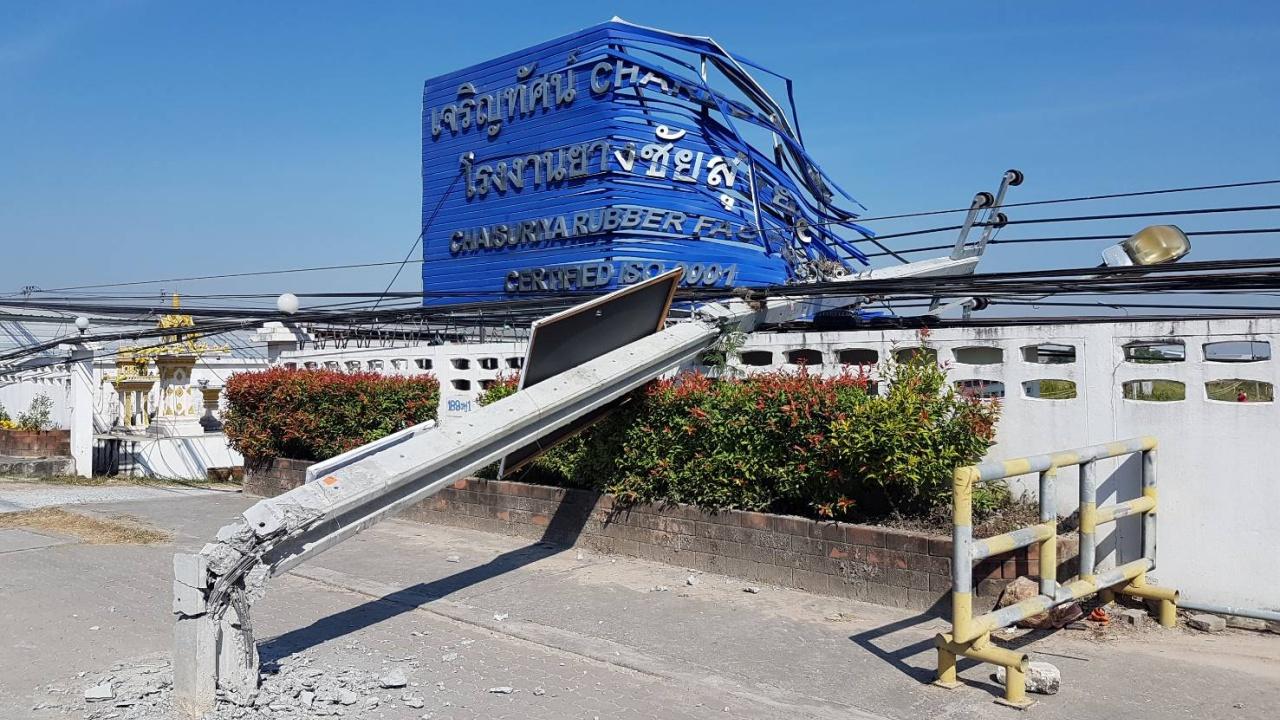 ในที่เกิดเหตุ ตรงข้ามซอยไทยประกัน 1 ถนนเทพารักษ์ พบรถเทรลเลอร์ 18 ล้อ บรรทุกตู้คอนเทนเนอร์เปล่า ยี่ห้อฮีโน่ สีขาว หมายเลขทะเบียนหัวลาก 70-0692 นครพนม และพ่วงท้ายหมายเลขทะเบียน 70-0693 นครพนม ของบริษัท วายทูเค ชิปปิ้ง จอดอยู่ข้างถนน ด้านบนของหลังคารถหัวลากเกี่ยวสายไฟฟ้าคาอยู่ ทำให้เสาไฟฟ้าบริเวณดังกล่าวหักโค่นและล้มลงจำนวน 17 ต้น ระยะทางยาวกว่า 600 เมตร ส่งผลให้การจราจรติดขัดยาวกว่า 2 กิโลเมตร โดยมีเสาไฟฟ้าบางต้นหักโค่นใส่แผ่นป้ายชื่อบริษัท และหลังคาบ้านเรือนประชาชนที่อยู่ในละแวกดังกล่าว ส่งผลให้เกิดไฟฟ้าดับในบริเวณดังกล่าว แต่ไม่มีผู้ได้รับบาดเจ็บหรือเสียชีวิต