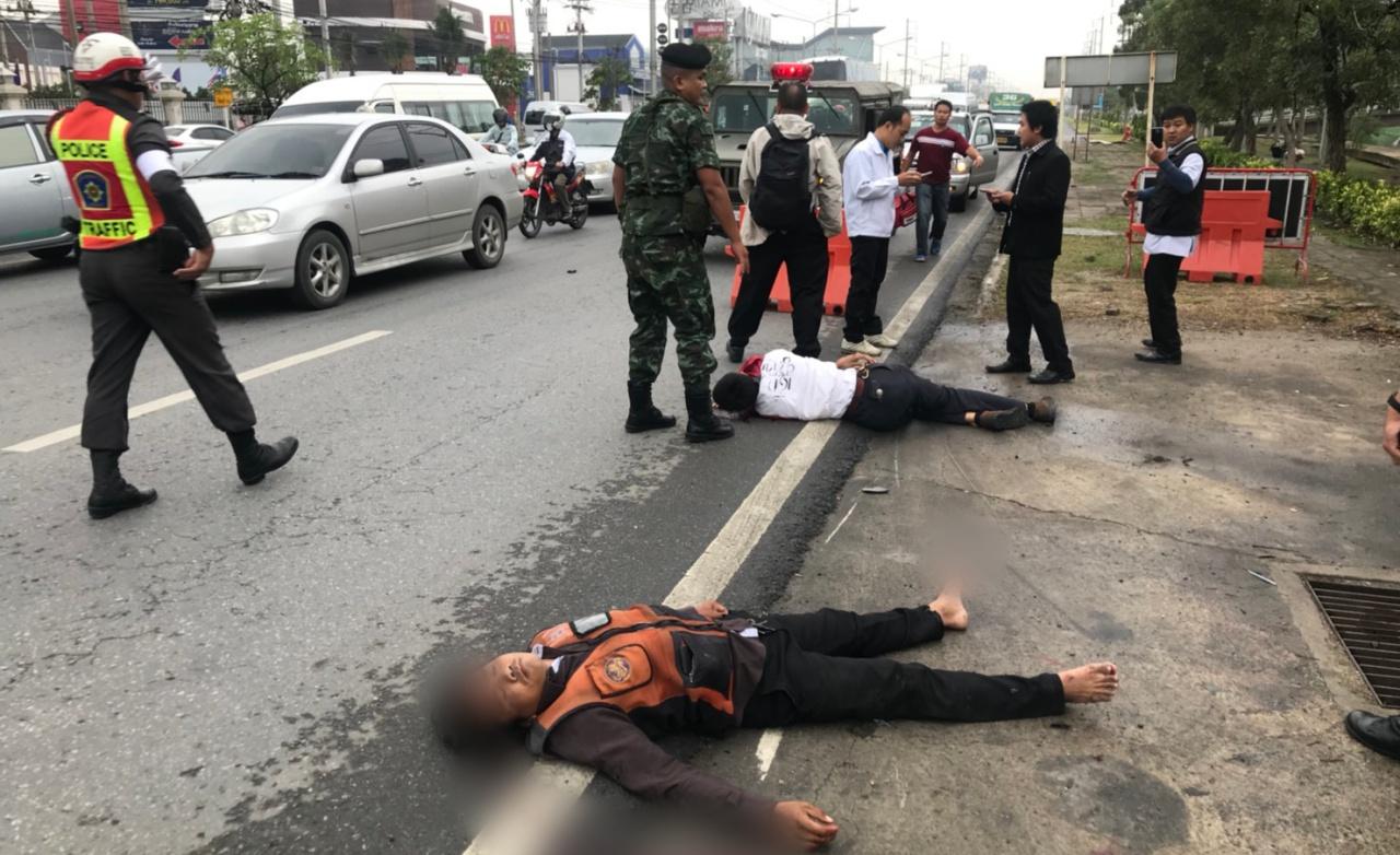 ที่ริมถนนพบร่างของ นายเขมชาติ ดาวอุดม อายุ 16 ปี นักเรียนโรงเรียนวิทยาลัยเทคนิคสมุทรปราการ นอนตะแคงแน่นิ่งอยู่บนพื้นถนน มีเลือดออกหู จมูก ปาก ศีรษะแตก อาการสาหัส ใกล้กันพบร่างนายทองมา ชาลีเขียว อายุ 41 ปี วินรถจักรยานยนต์รับจ้าง นอนหงายอยู่กลางถนน มีแผลแตกที่ศีรษะ เจ้าหน้าที่ได้ให้การปฐมพยาบาลเบื้องต้น ก่อนรีบนำส่งโรงพยาบาลรัทรินทร์
