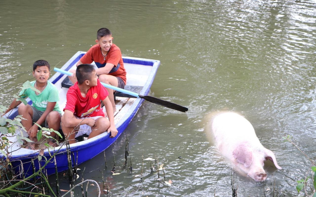 เมื่อช่วงเย็นวันที่ 7 ม.ค. หน่วยกู้ภัยฉะเชิงเทรา เดินทางมายังวัดบางผึ้ง หมู่ 1 ต.บางผึ้ง อ.บางปะกง จ.ฉะเชิงเทรา หลังรับแจ้งจากพระครูปลัด สายัณห์ ปัญญาธีโป อายุ 58 ปี รองเจ้าอาวาสวัดบางผึ้ง ว่าเจ้าอู๊ด หมู น้ำหนักกว่า 200 กิโลกรัม ที่เลี้ยงไว้ในวัดได้เดินพลัดตกแม่น้ำบางปะกง เมื่อไปถึงทางพระณัฐพงศ์ โสภโณ อายุ 53 ปี พระลูกวัด ได้พาไปชี้จุดเจ้าอู๊ด ลอยคออยู่ในแม่น้ำบริเวณข้างวัด ในสภาพเริ่มหมดแรง