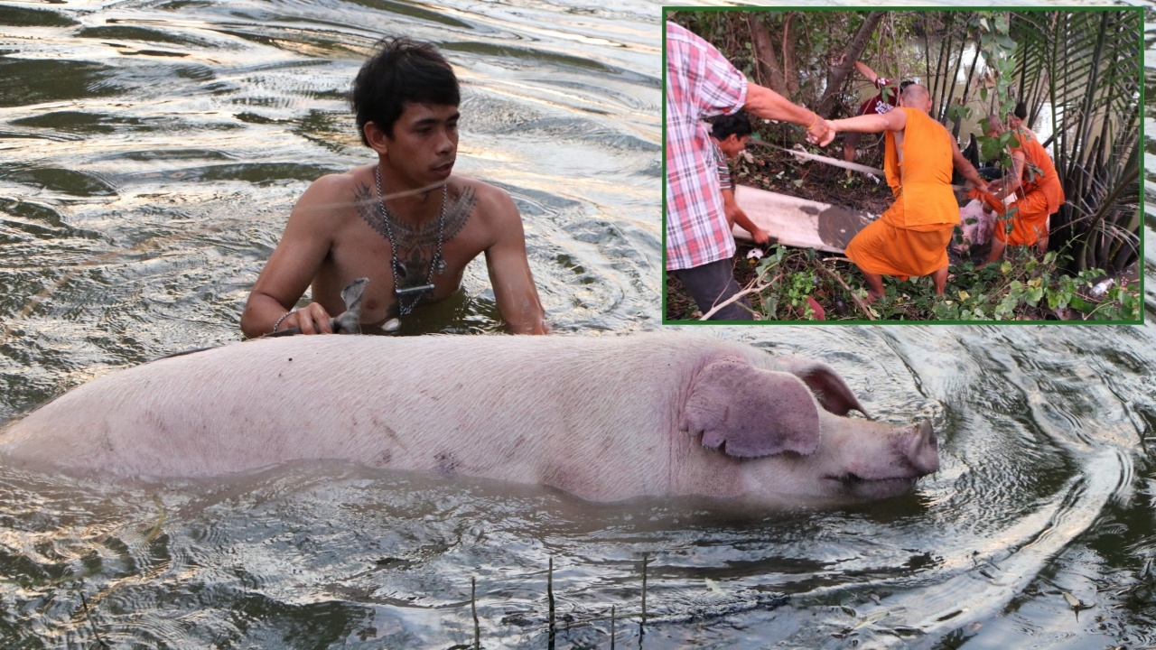 “เจ้าอู๊ด” หมูในวัดบางผึ้ง หนักกว่า 200 โล พลัดตกลงไปในแม่น้ำบางปะกง ชาวบ้านและพระกรูเข้าช่วยตั้งแต่เช้า เอาขึ้นมาบนฝั่งไม่สำเร็จ ต้องเรียกกู้ภัยให้มาช่วย ใช้เวลานานกว่าชั่วโมง จึงนำตัวขึ้นมาได้ในสภาพสะบักสะบอม...