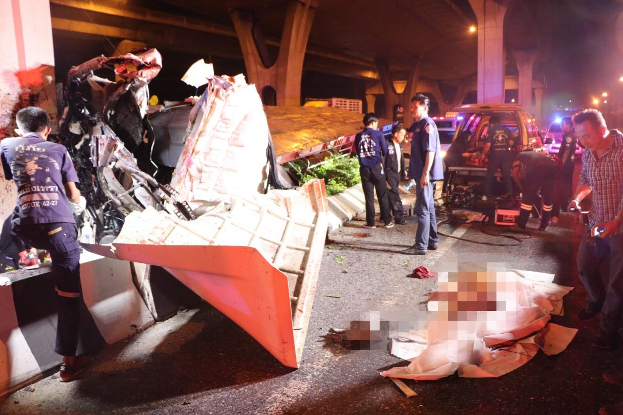 ที่เกิดเหตุ พบรถพ่วง 18 ล้อ ฮีโน่ สีขาว ทะเบียนตัวแม่ 72-0033 สมุทรปราการ ทะเบียนตัวพ่วง 70-0003 สมุทรปราการ บรรทุกม้วนเหล็ก เสียหลักเหินข้ามแบริเออร์เกาะกลาง ไปชนอัดตอม่อ ทางด่วนบูรพาวิถี จนทำให้ม้วนเหล็กที่บรรทุกมาจำนวน 3 ม้วน น้ำหนักรวม 30 ตัน ขาดออกจากโซ่ กระเด็นมาอัดหัวรถ ที่มีคนขับติดอยู่ภายในรถซ้ำ ทำให้ นายสงวนศักดิ์ พันทัศน์ อายุ 25 ปี คนขับร่างขาดเป็น 4 ส่วน และมีเศษชิ้นเนื้อกระจายเกลื่อนถนน เจ้าหน้าที่ต้องรวบรวมชิ้นส่วนทั้งหมดมากองไว้ที่เดียวกัน และต้องใช้เครื่องตัดถ่างนำชิ้นส่วนมนุษย์ ที่ติดคาซากรถออกมาด้วย