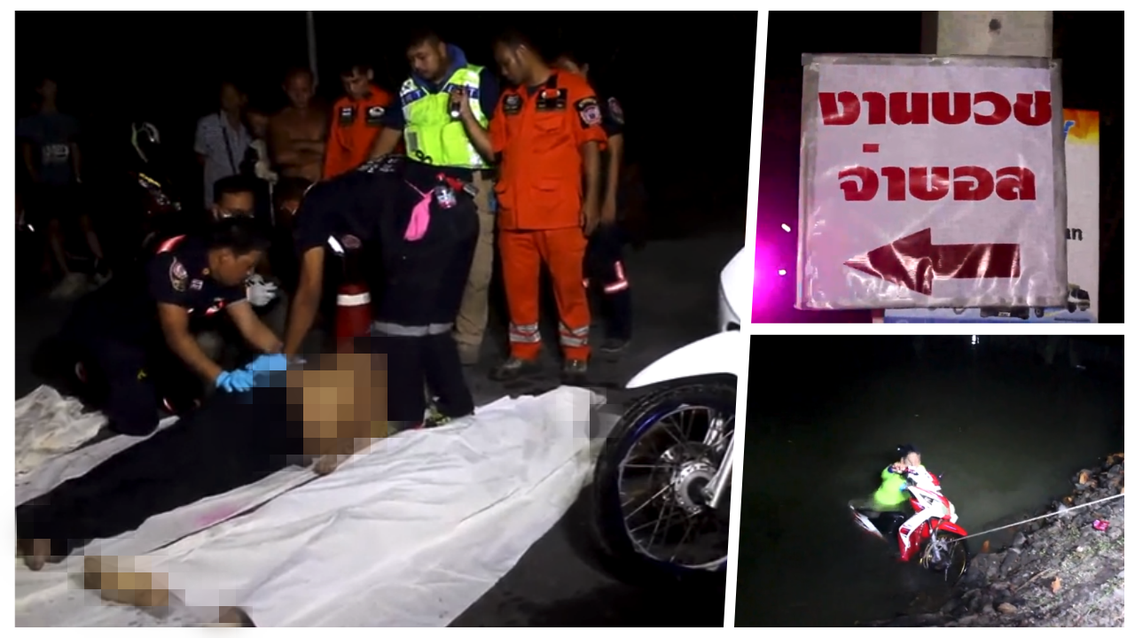 จากการสอบถามนายหนึ่ง เพื่อนผู้ตาย บอกว่า ตนขี่รถหมายเลขทะเบียน 4 กท 7829 กรุงเทพมหานคร ออกจากงานเลี้ยงบวชเพื่อน มากับอีก 2 คนที่สียชีวิต เมื่อมาถึงหน้าปากซอยได้เสียหลักตกลงไปในคลองทั้ง 2 คัน แต่ตนขับมาคนเดียวจึงขึ้นมาจากน้ำได้ ส่วนเพื่อนอีก 2 คนจมหายไป จึงได้ไปเรียกให้ชาวบ้านมาช่วยกันหา แต่หาไม่เจอ จนนักประดำน้ำของมูลนิธิป่อเต็กตึ๊งมาช่วยกันงมหาก็พบว่าเพื่อนทั้ง 2 คนจมอยู่กลางคลองเสียชีวิตแล้ว.