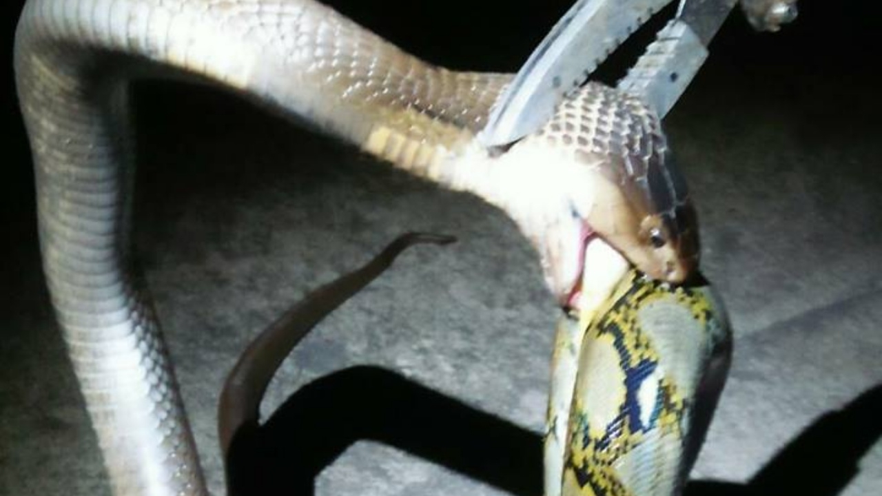 เมื่อช่วงดึกวันที่ 28 ม.ค. ผู้ใช้เฟซบุ๊กชื่อ ”ทรงภพ รุงสันเทียะ” ส่งข้อมูลมายังเพจไทยรัฐว่า เมื่อเวลา 22.00 น. วันที่ 26 ม.ค.ที่ผ่านมา ศูนย์วิทยุ 191 นนทบุรี รับแจ้งจากประชาชน หมู่บ้านบัวทองธานี บริเวณบ้านเลขที่ 14/30 ได้มีงูเข้าบ้าน ซึ่งเมื่อเจ้าหน้าที่เข้าตรวจสอบพบงูเห่ากำลังกินงูเหลือม โดยมีคลิปขณะงูเห่าความยาวประมาณ 2 เมตรกว่า กำลังขยอกกินงูเหลือมความยาวใกล้เคียงกัน จากนั้นเจ้าหน้าที่ได้นำคีมเหล็กจับงูทั้งสองตัวในสภาพหัวงูเหลือมอยู่ในปากงูเห่าขนาดใหญ่ ท่ามกลางวิพากษ์วิจารณ์ของผู้พบเห็นถึงความใหญ่ของงูในทำนองว่า ”นี่คือของจริง”.