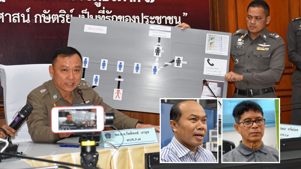 พล.ต.ท.กิตติพงษ์ เงามุข ผบช.ภ.7 นำชาร์ตการขายลอตเตอรี่อลเวง 30 ล้าน แถลงยันครูปรีชา ใคร่ครวญ (เล็กซ้าย) ซื้อจากแม่ค้า ส่วน ร.ต.ท.จรูญ วิมูล (เล็กขวา) เก็บสลากฯ ได้ ถูกแจ้งยักยอกทรัพย์ที่หล่นหายกับรับของโจร.