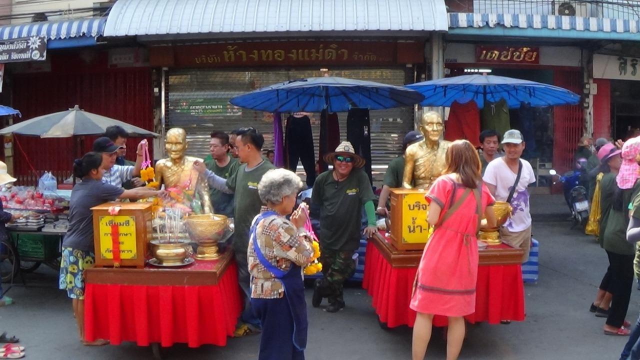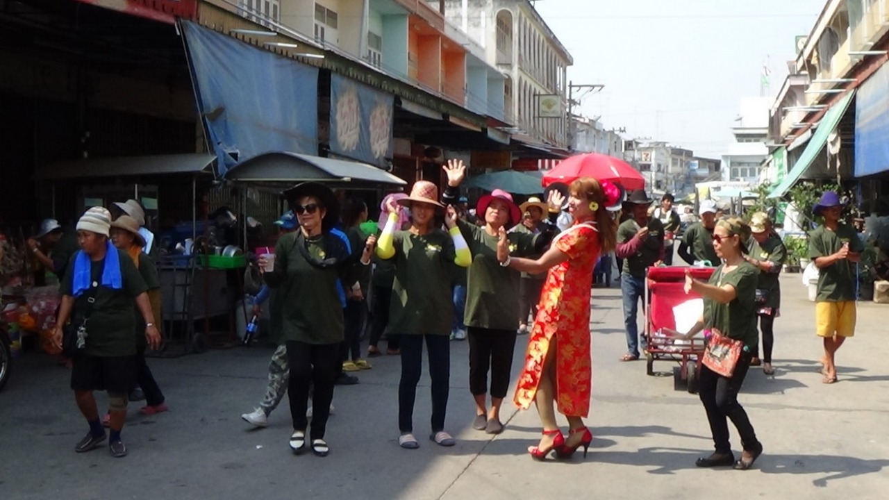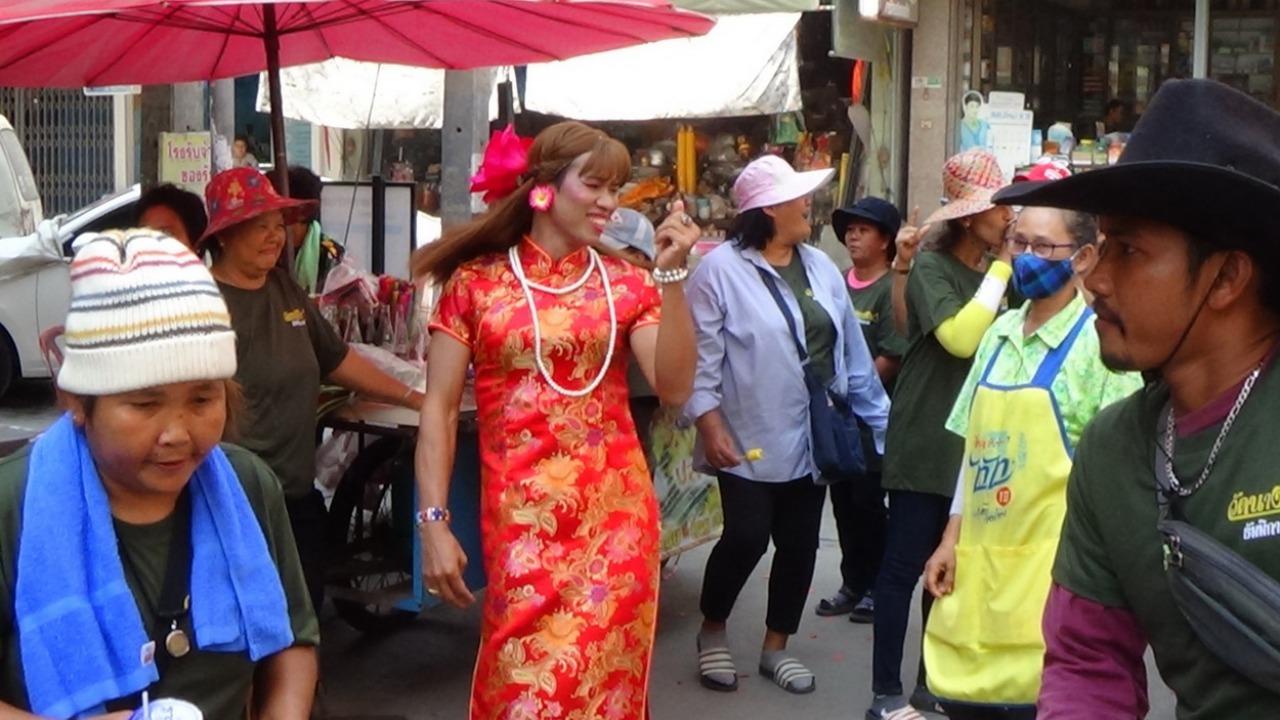 กะเทยสวมกี่เพ้าออกมาเต้นสร้างสีสันให้ขบวนแห่หลวงพ่อนุ่ม หลวงพ่อชม เกจิดังแห่งอำเภอวิเศษชัยชาญ ให้ประชาชนได้กราบไหว้ บริเวณตลาดเก่า 100 ปี ก่อนงานปิดทอง...