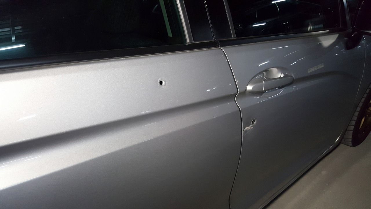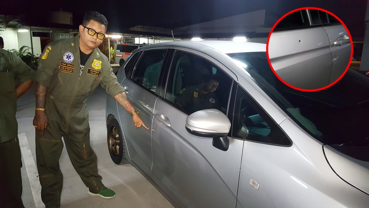ขณะที่ บริเวณลานจอดรถของโรงพยาบาล พบรถยนต์ฮอนด้าแจ๊ซ 5 ประตู สีบรอนซ์-เงิน หมายเลขทะเบียน 4 กย 8430 กทม. ของผู้บาดเจ็บจอดอยู่ บริเวณเบาะที่นั่งคนขับพบรอยเลือด และรอยลูกกระสุนปืนเจาะเข้าไปด้านใน 1 นัด บริเวณข้างรูเสียบกุญแจพบรอยคล้ายลูกกระสุนปืนถากไปเป็นรอยบุบ ด้านประตูด้านท้ายรถและกันชนท้ายมีรอยลูกกระสุนปืนเจาะเข้าอีกจำนวน 2 นัด