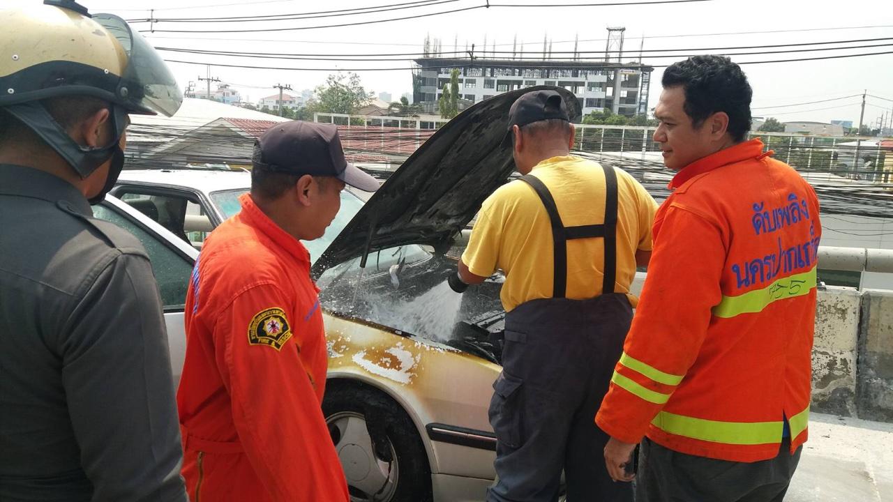 เมื่อเวลา 12.45 น. วันที่ 17 ก.พ. ร.ต.อ.สมโภช สืบวงศกร รอง สว.(สอบสวน) สภ.ปากเกร็ด จ.นนทบุรี รับแจ้งเหตุเพลิงลุกไหม้รถเก๋งบนสะพานข้ามแยกสวนสมเด็จฯ ถนนศรีสมาน ฝั่งมุ่งหน้าไปทาง จ.ปทุมธานี ต.บ้านใหม่ จึงพร้อมเจ้าหน้าที่เกี่ยวข้อง ไปตรวจสอบ