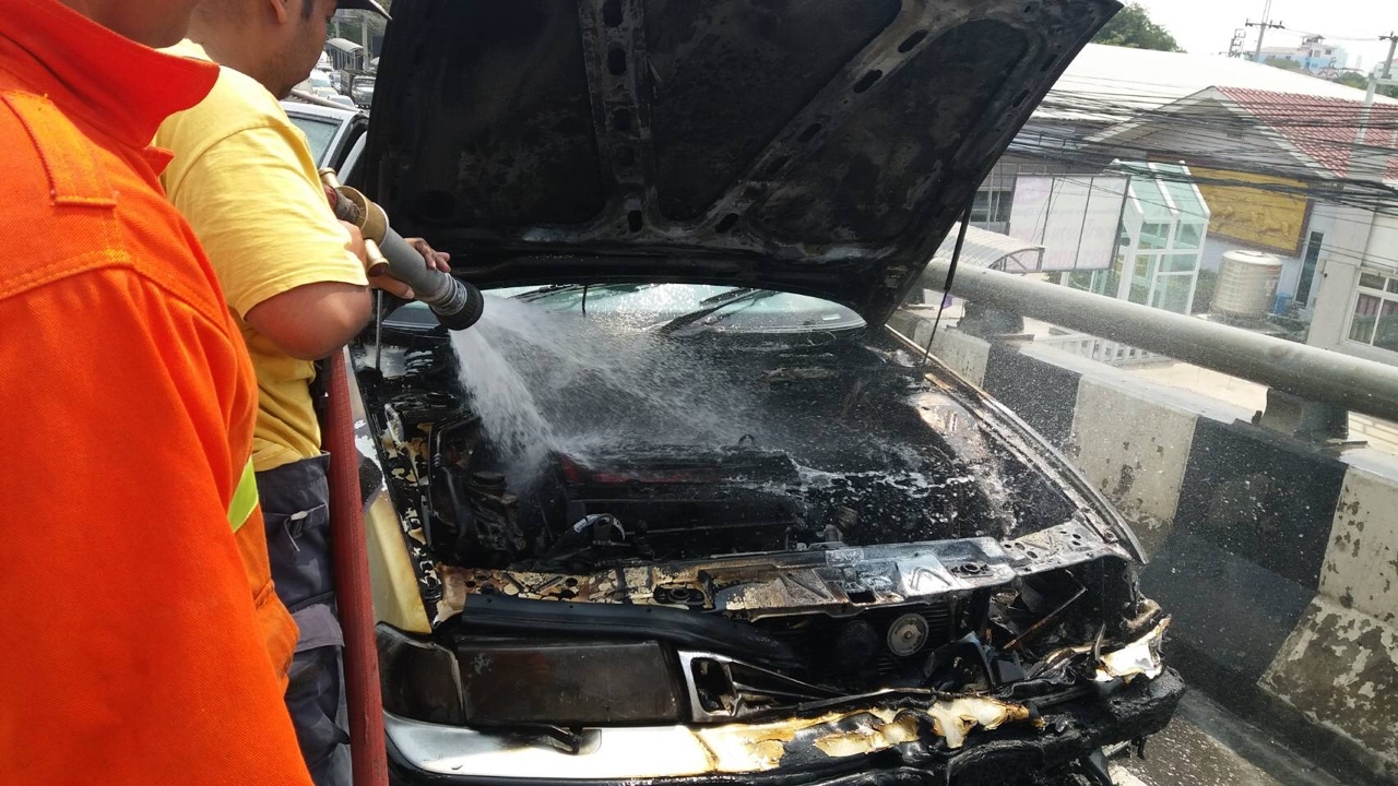 ตรวจสอบเบื้องต้น พบว่าห้องเครื่องยนต์ ฝากระโปรง และด้านหน้ารถถูกไฟไหม้ได้รับความเสียหาย