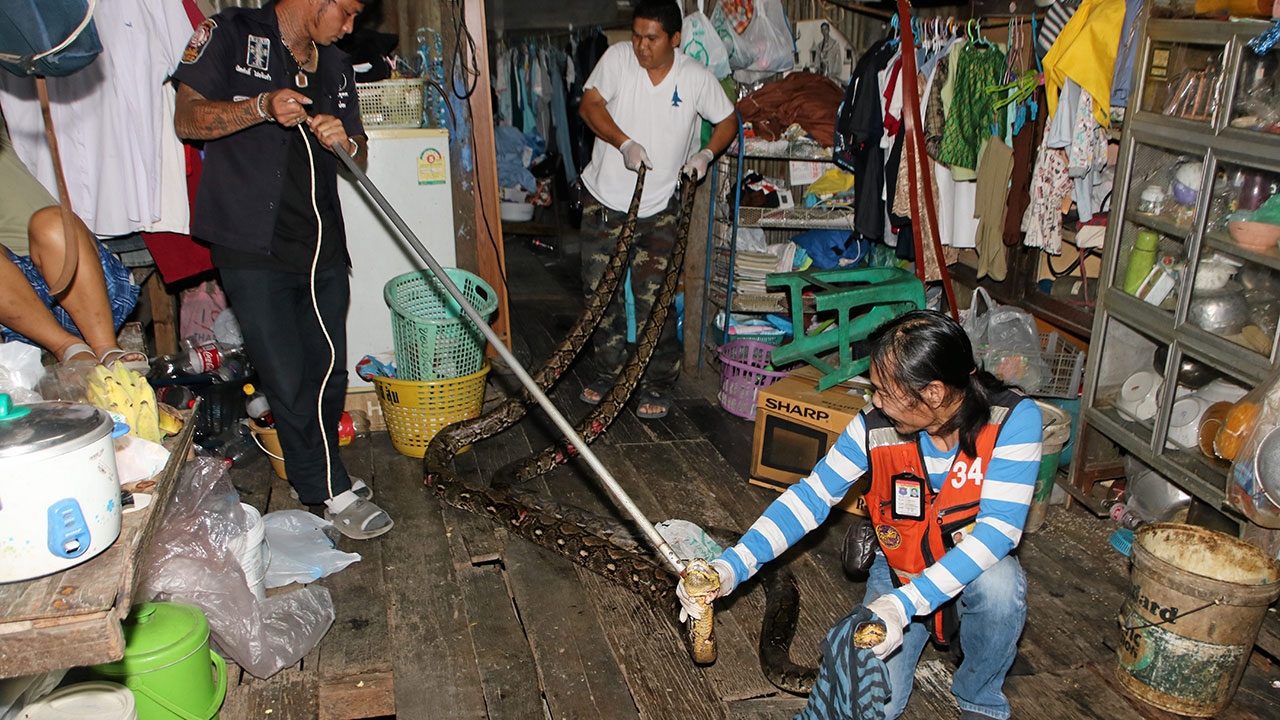 เจ้าหน้าที่ช่วยกันจับงูเหลือมขนาดใหญ่ 2 ตัว ความยาวประมาณ 3 เมตร หลังเลื้อยเข้ามาในบ้านเลขที่ 400/355 ลำลูกกา (คลอง 2) หมู่ 8 ต.คูคต อ.ลำลูกกา จ.ปทุมธานี ก่อนรัดตุ๊กแกแล้วกัดกันเองจนเป็นแผลเหวอะหวะ.