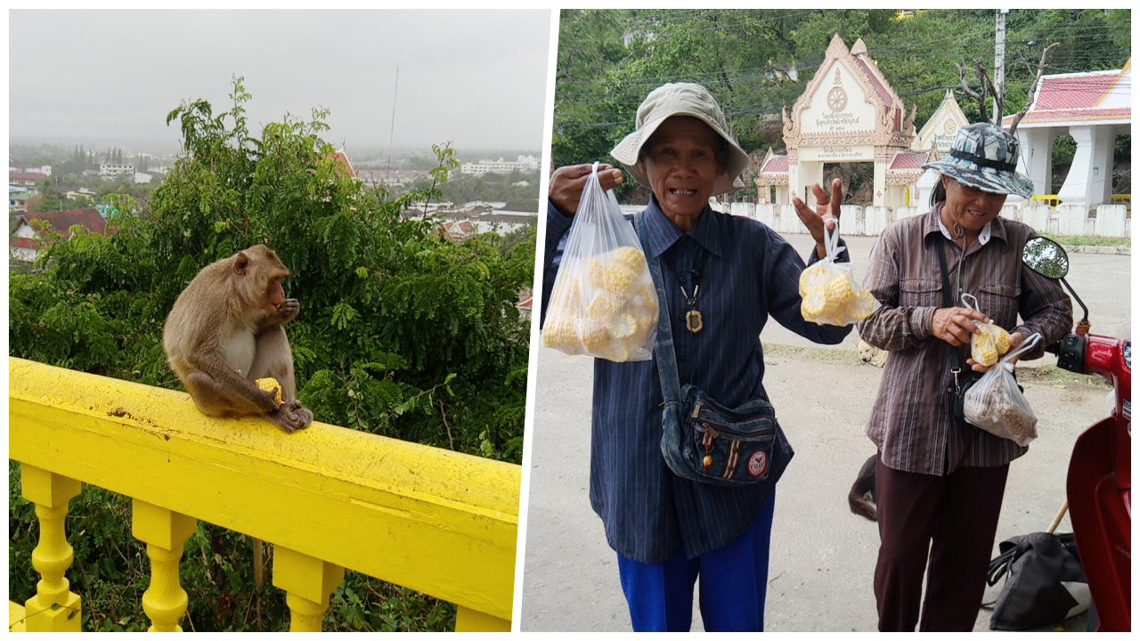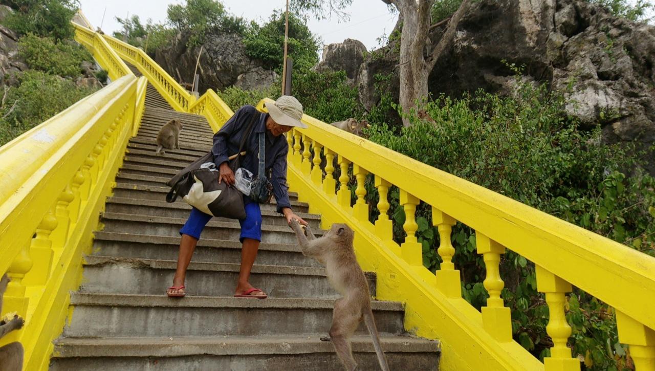 "ลิงกลุ่มบนยอดเขาอดอาหารมากที่สุด เพราะนักท่องเที่ยวส่วนใหญ่อยู่ด้านล่างซื้ออาหารแจกแต่รอบบริเวณเขา ส่วนด้านบนน้อยคนจะขึ้นไป ทำให้ลิงอดอยากประกอบกับจำนวนลิงที่มีมากที่สุด ซึ่งลิงแต่ละฝูงไม่ถูกกัน ต้องแยกกันอยู่แบ่งพื้นที่อย่างชัดเจน ส่วนอาหารที่ลิงชอบจะเป็นข้าวโพด ถั่วลิสง กล้วยทุกชนิด แต่ที่โปรดปรานคือ กล้วยไข่ ซึ่งราคาสูงกว่ากล้วยน้ำว้ามาก ทำให้บางคนเข้าใจว่าลิงชอบกินอาหารหรู"
