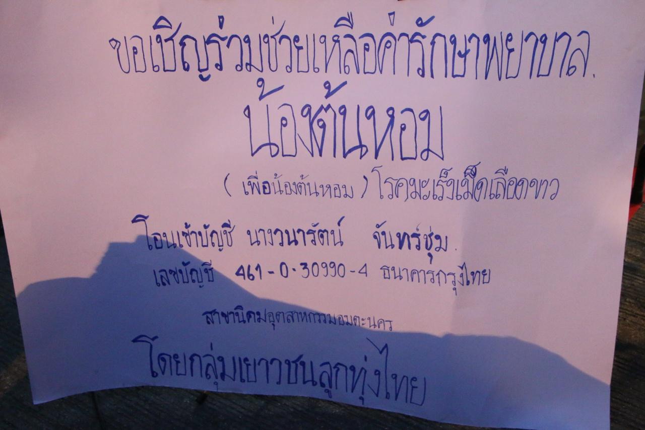 กลุ่มเพื่อนเยาวชนลูกทุ่งไทย รวมกันร้องเพลงเปิดหมวก เพื่อนำเงินที่ได้รับบริจาคไปช่วยเหลือค่ารักษาพยาบาลให้"น้องต้นหอม" เพื่อนในกลุ่มที่ป่วยเป็นโรคมะเร็งเม็ดเลือดขาวและปอดติดเชื้อ