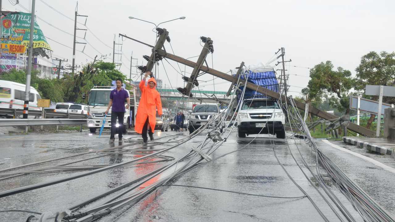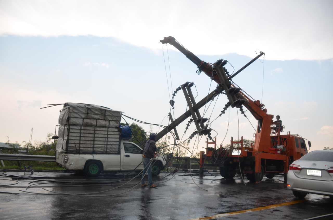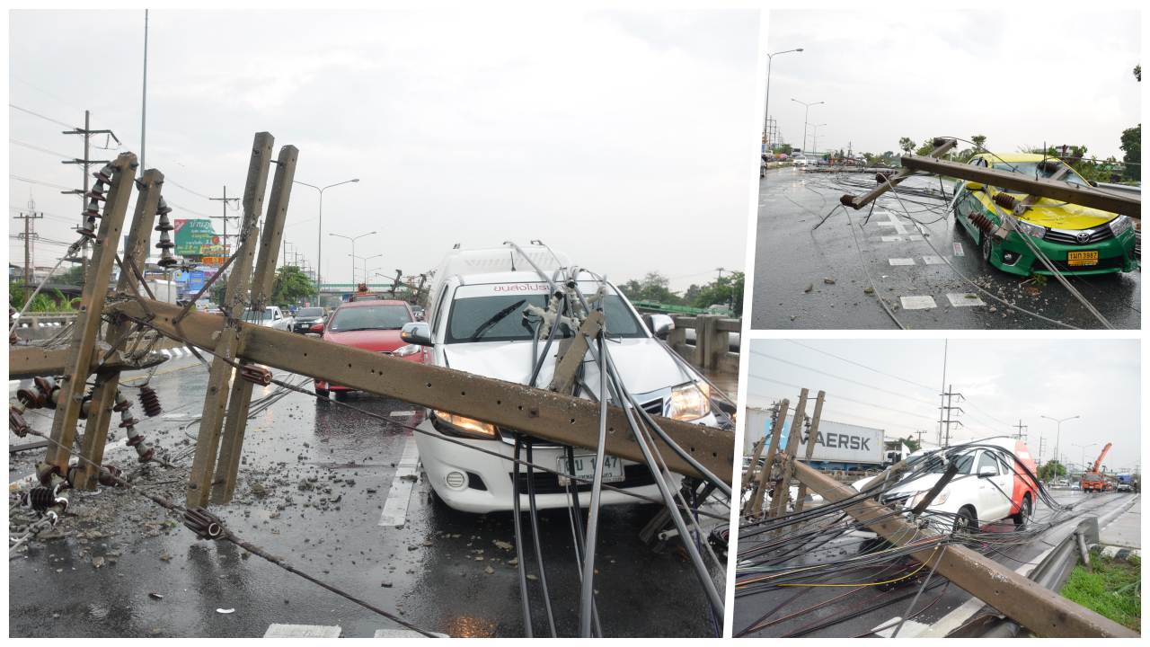 พายุลมฝนพัดกระหน่ำ ทำเสาไฟฟ้าริมถนน รังสิต-นครนายก ธัญบุรี ล้มระเนระนาด 11 ต้น ทับรถ 5 คัน มีผู้บาดเจ็บ 4 คน ทำรถติดยาว 10 กม. การไฟฟ้าฯ เร่งยกเสาเคลียร์ทาง
