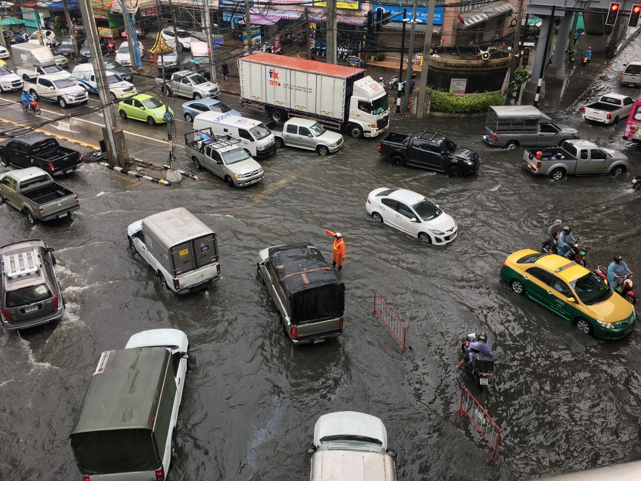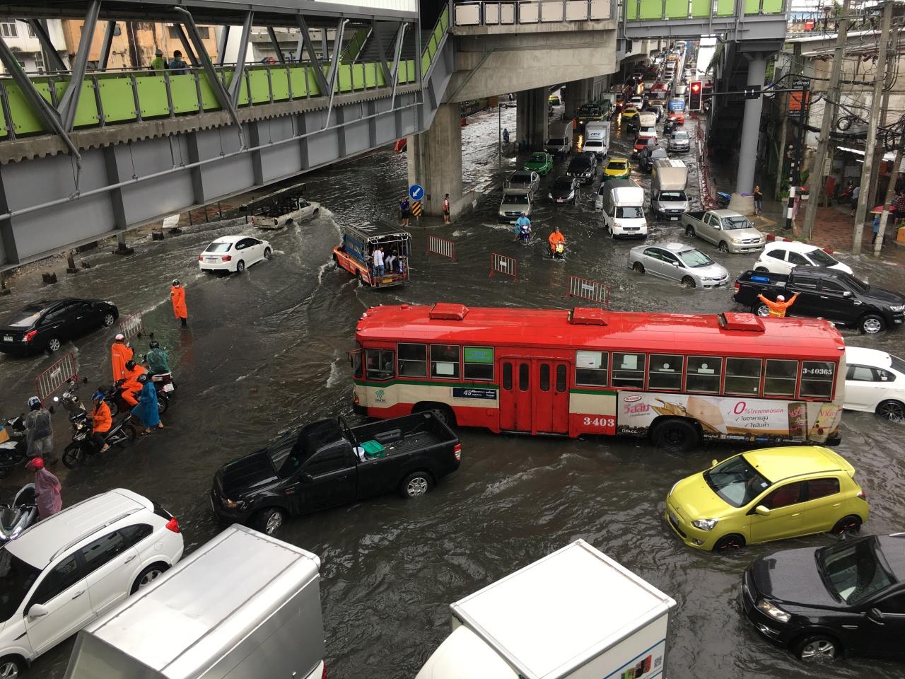 บริเวณ ถนนสุขุมวิท ตั้งแต่ สามแยกเทพารักษ์ หน้า สภ.สำโรงเหนือ แยก ปู่เจ้าสมิงพราย ยาวไปถึง หน้าห้างบิ๊กซีจัมโบ้ โดยระดับน้ำบางช่วงสูงถึง 30-50 ซม. และบริเวณถนนพุทธรักษา มีน้ำท่วมขังสูง 20-30 ซม. จากปัญหาดังกล่าว ทำให้รถเล็กสัญจรลำบาก จนเกิดชะลอตัวติดสะสม ระยะทางหลายกิโลเมตร